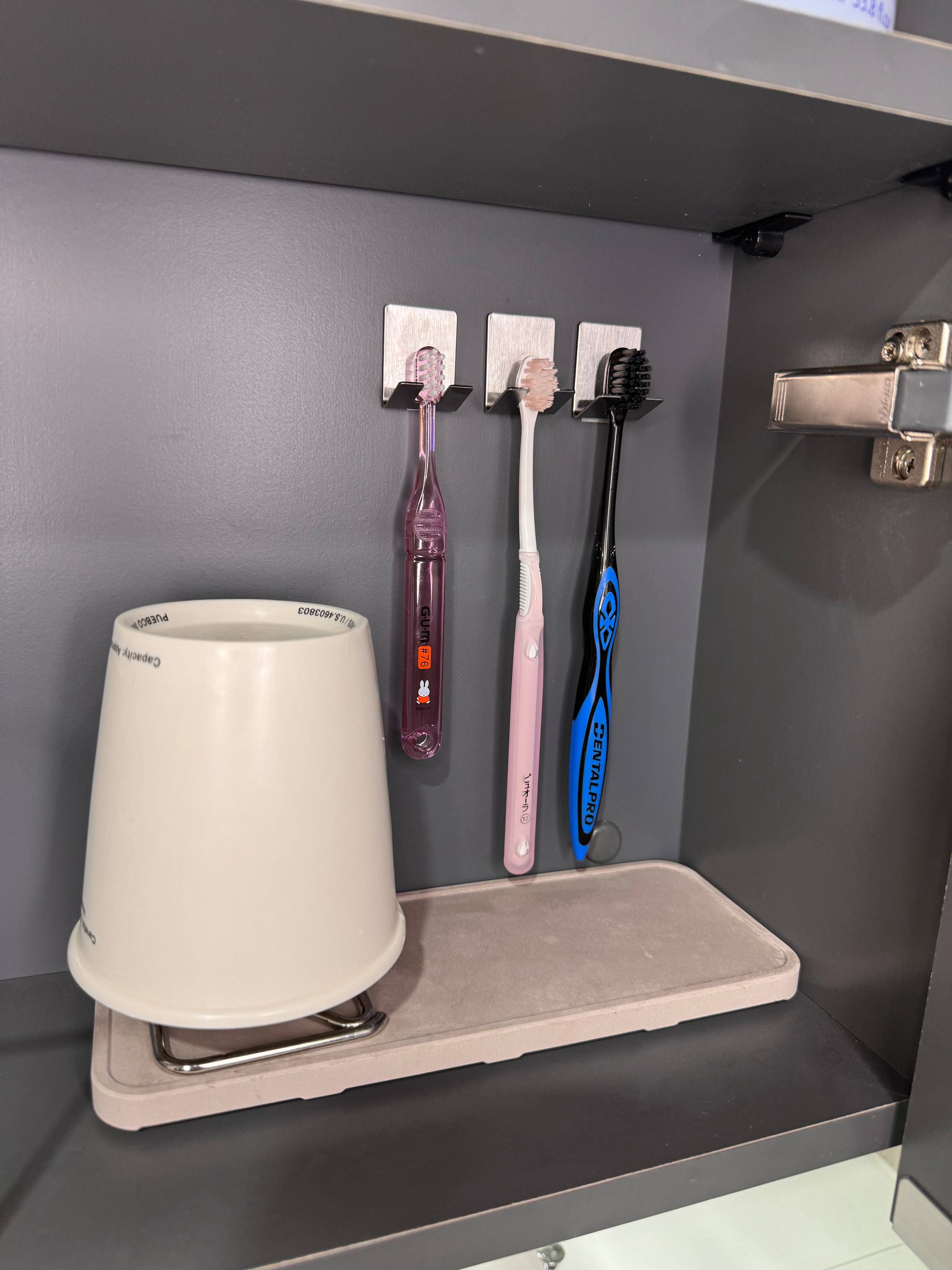 だから、我が家はニトリの吸水多孔質セラミックストレー(799円)の上にニトリの歯ブラシスタンド(399円)をコップ立てとして置いて、ダイソーの歯ブラシホルダーで歯ブラシを吊るすことに。