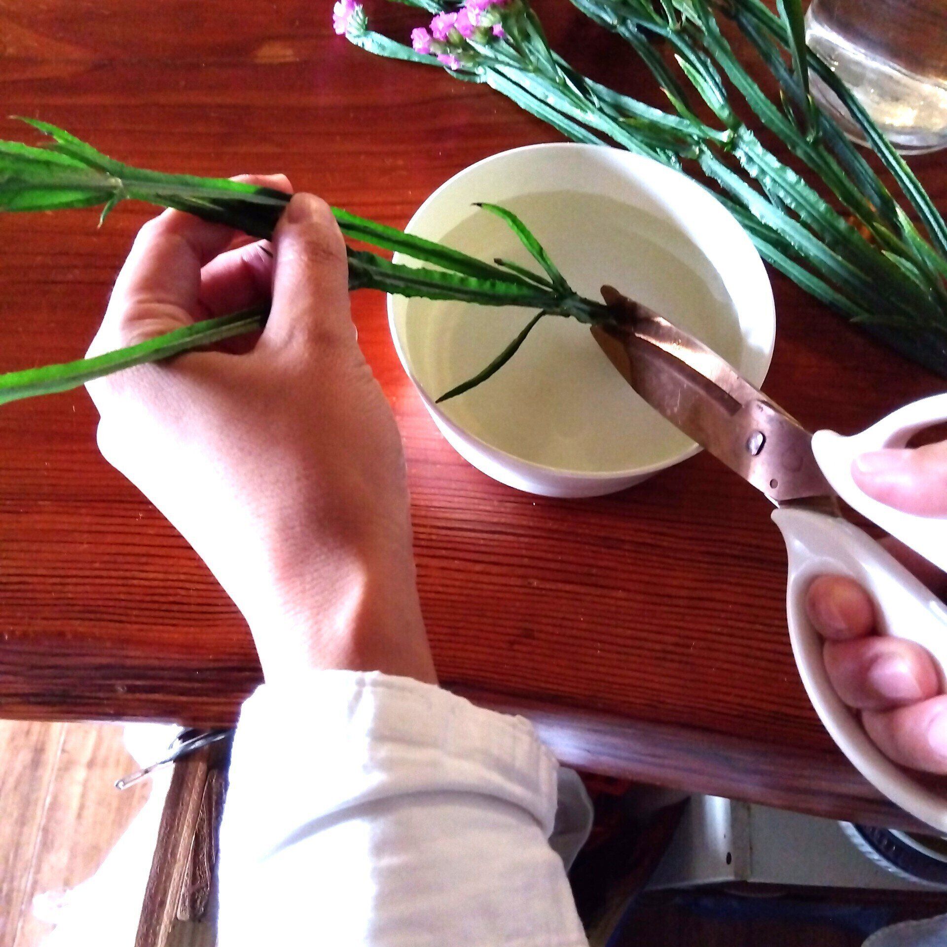 茎をカットするときは、水に切り口が浸かるようにしてからカットします。そうすると茎がしっかり水を吸ってくれるので、花が長持ちするのです。