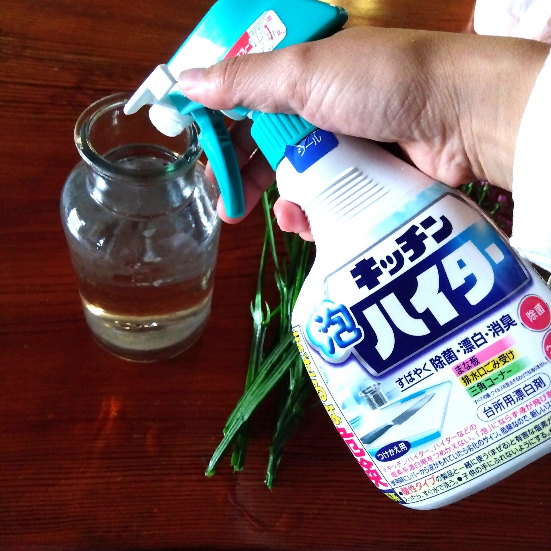 毎日水が替えられないときや夏場など気温が高いときは、花瓶の中に1滴だけキッチンハイターを垂らして雑菌予防。