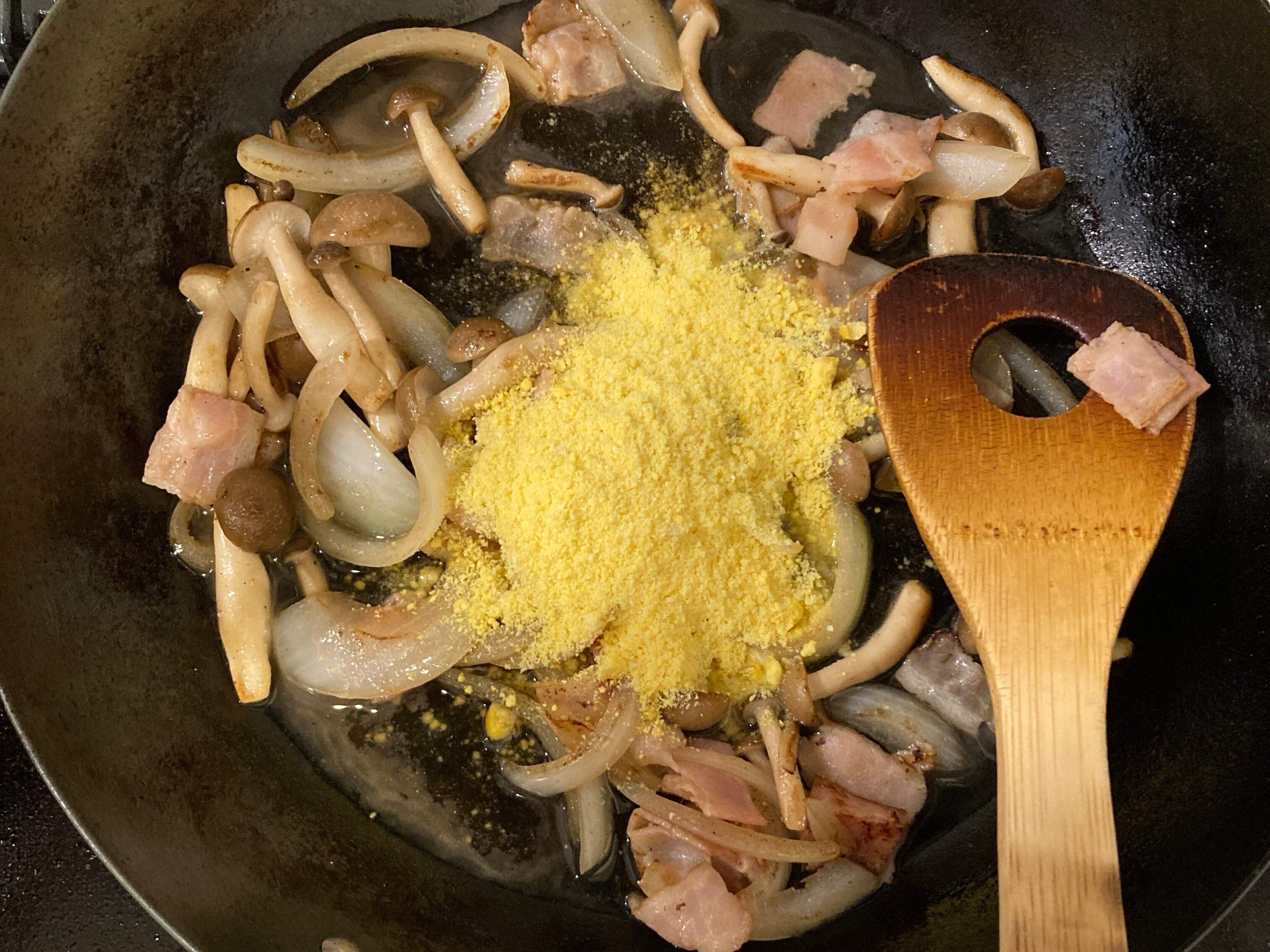 熱したフライパンに、玉ねぎ・ベーコン・しめじを炒め、コーンポタージュのもと1袋を入れます。予想通り、トロミがでてきたので、牛乳で伸ばしていき、塩コショウで味を整えて完成です。
