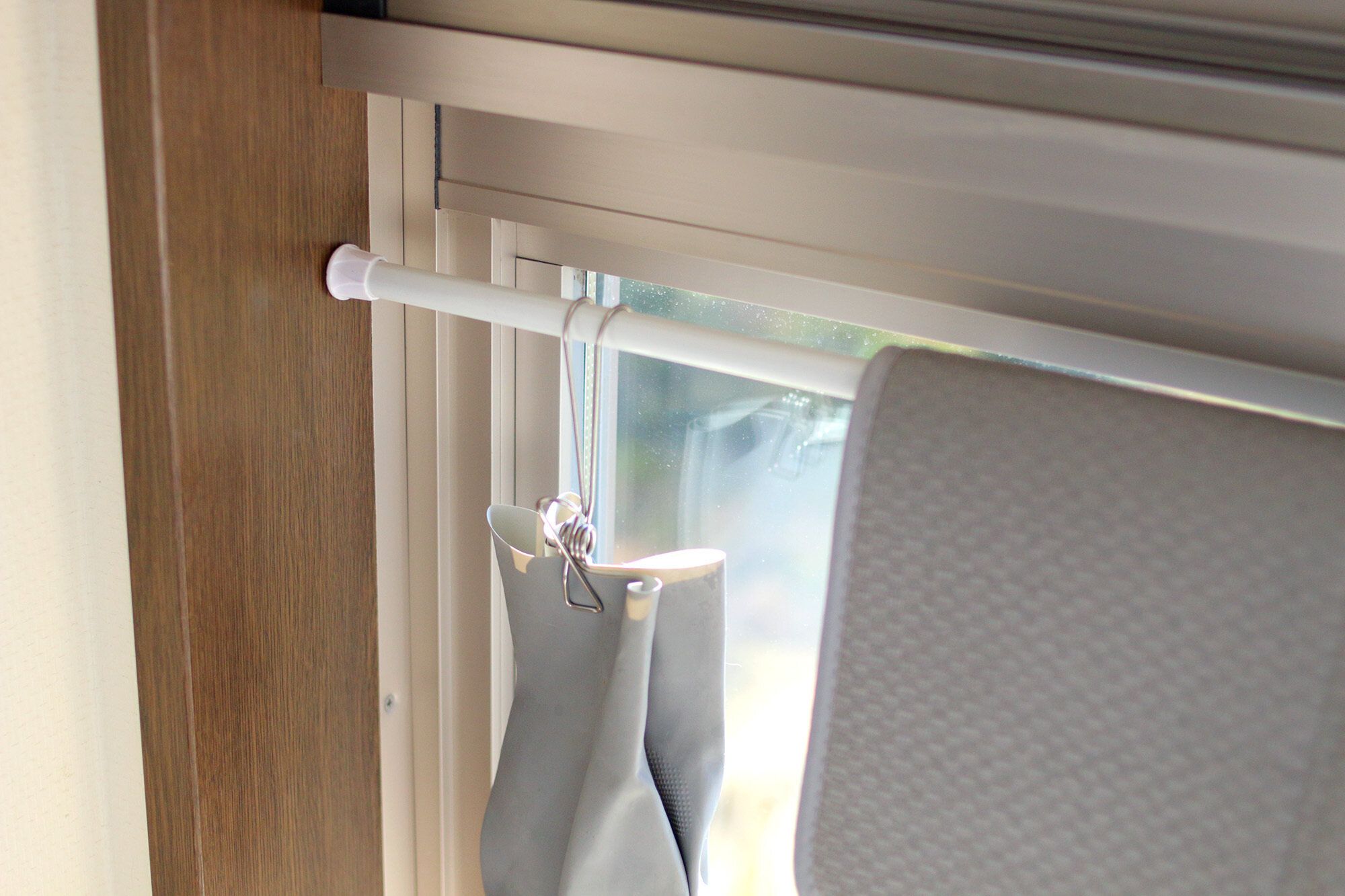 窓辺につっぱり棒を取りつけて、ぬれたクロスやゴム手袋を乾かすスペースに。晴れている日なら、1時間もあれば乾いてしまいます。