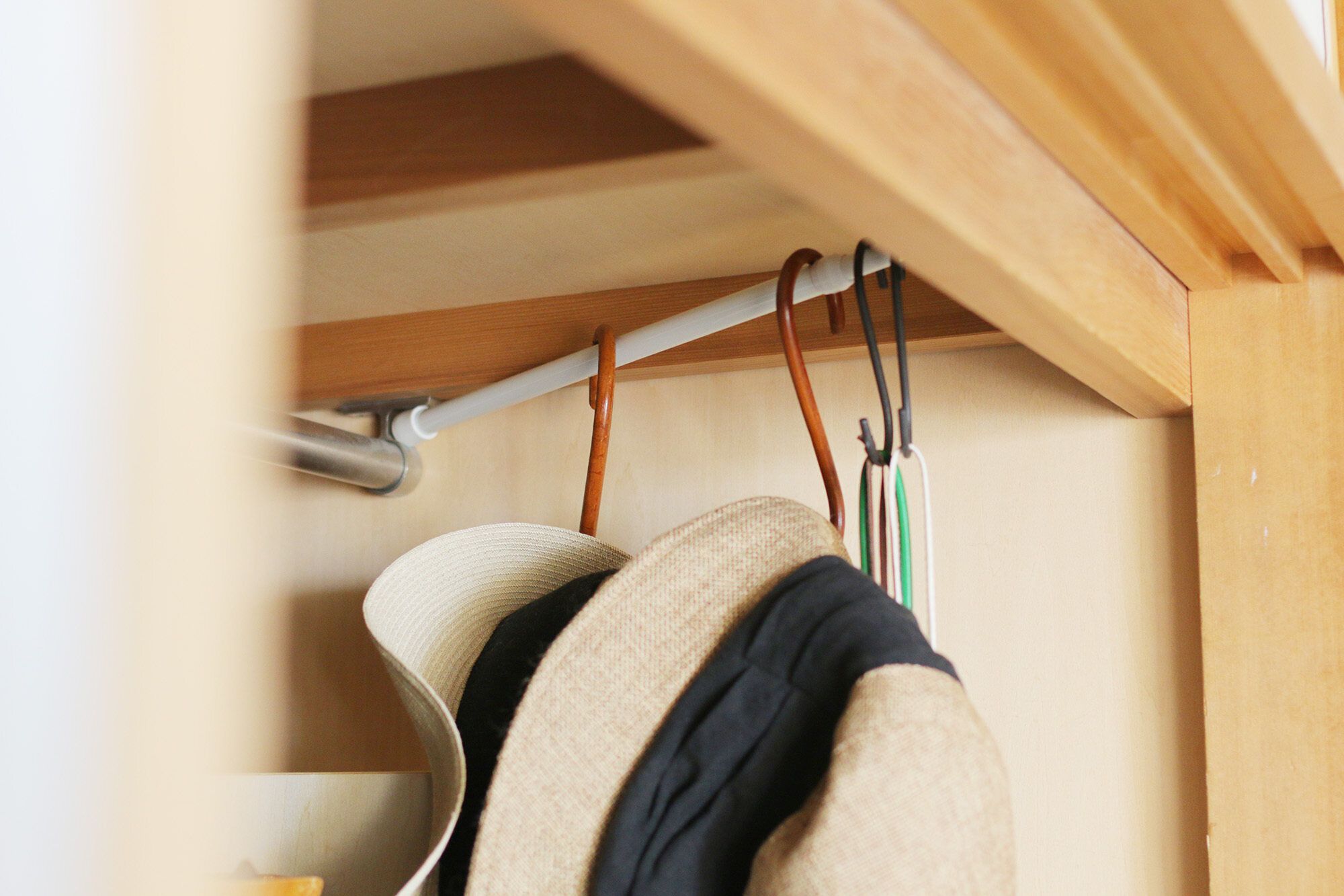 押入れの空いたスペースにつっぱり棒を使えば、帽子やバッグ、入校証などふだん使うものをぶら下げておけるスペースに早変わり!