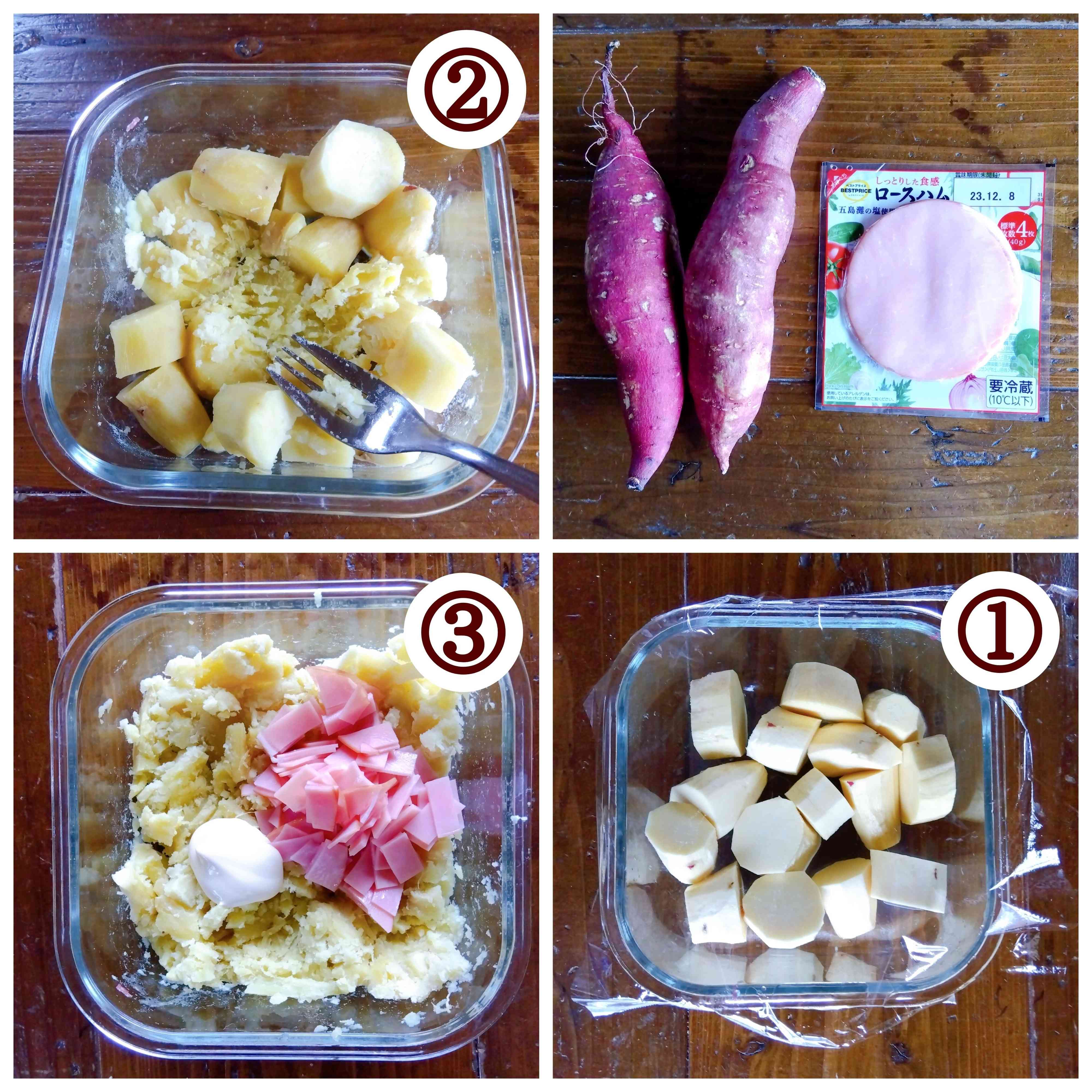 1.さつまいもの皮をむき、カットして500Wで6分レンチン