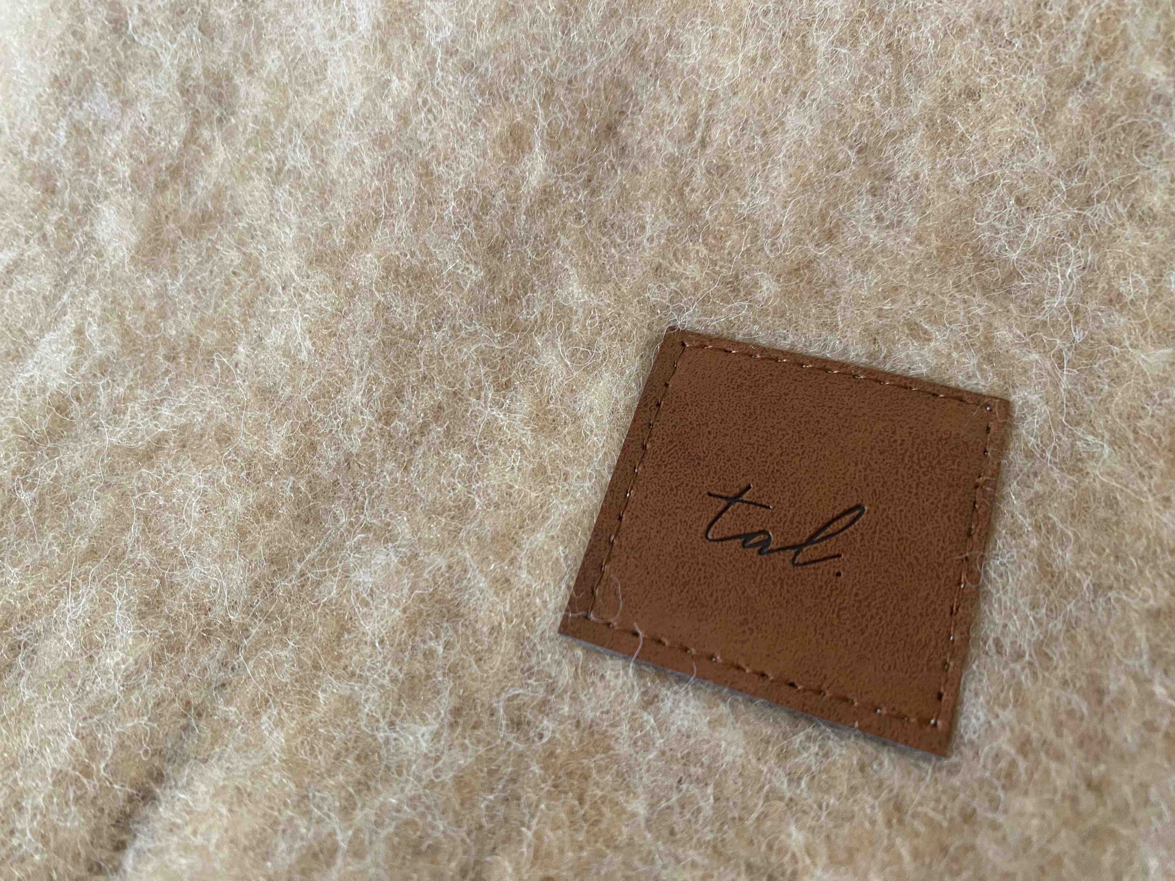 太めのフリンジと、ワンポイントで合皮素材のタグが縫い付けられています。
