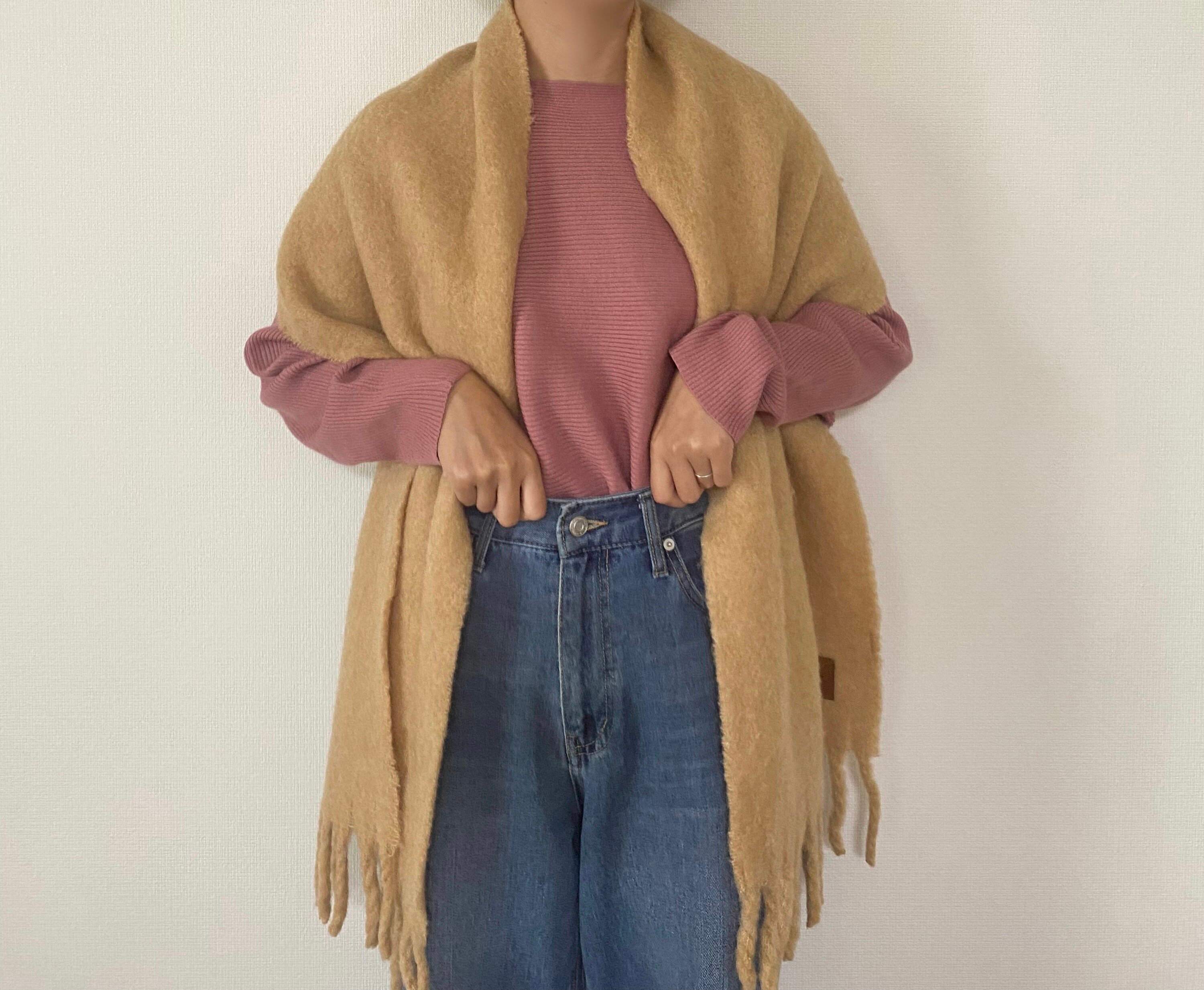 大判サイズなので肩から羽織っても腿の辺りまで長さがあり、しっかり寒さを防げます。