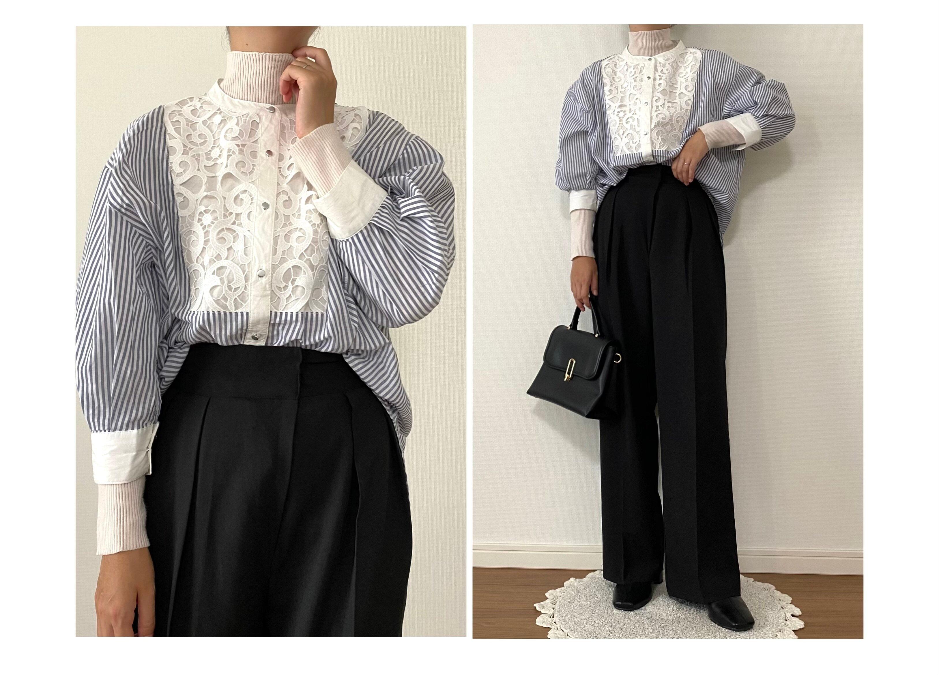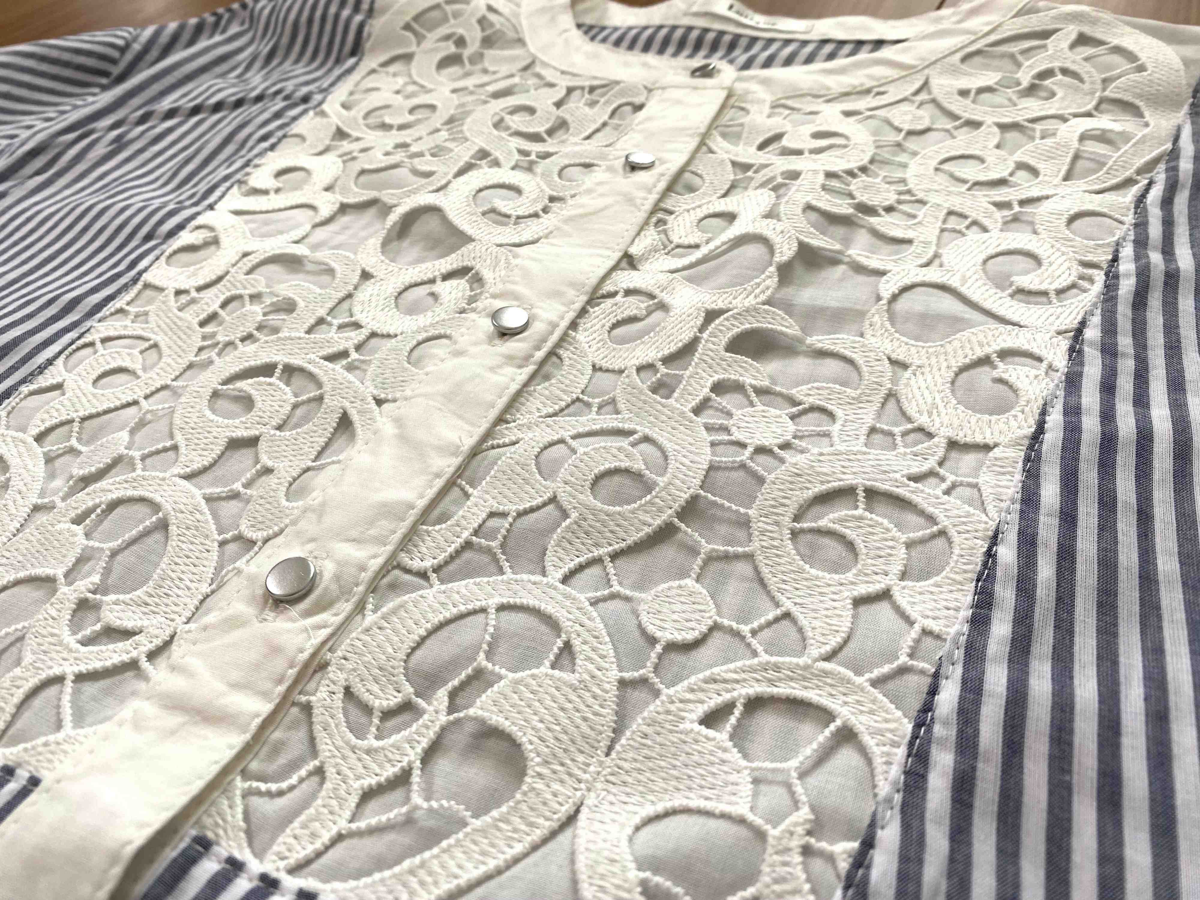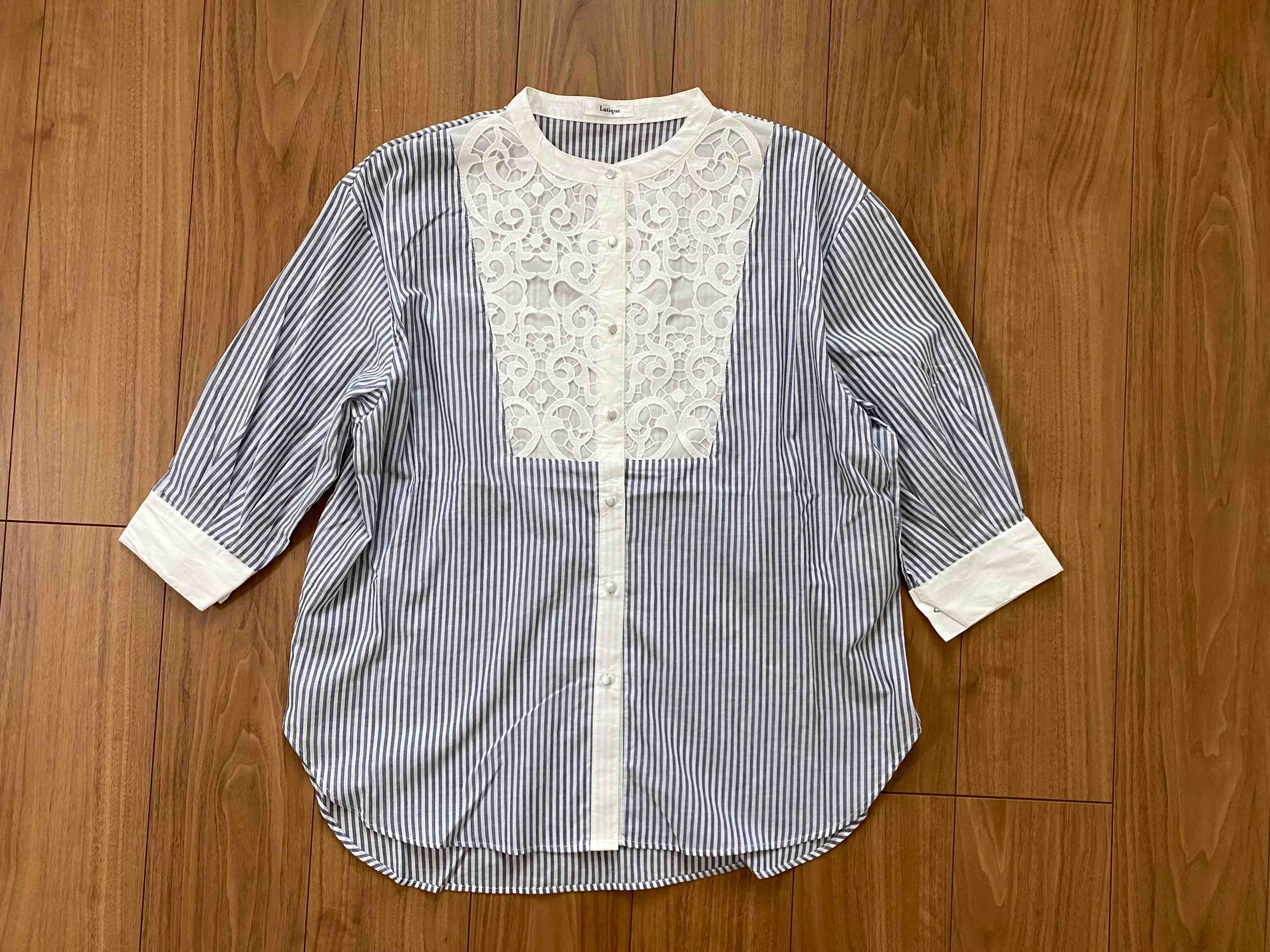 胸元にレース生地があしらわれた七分袖のストライプシャツです。