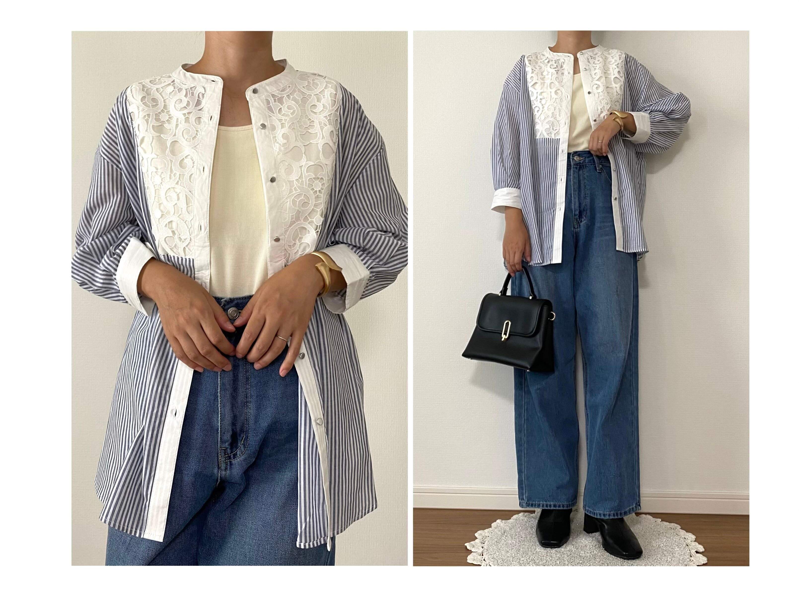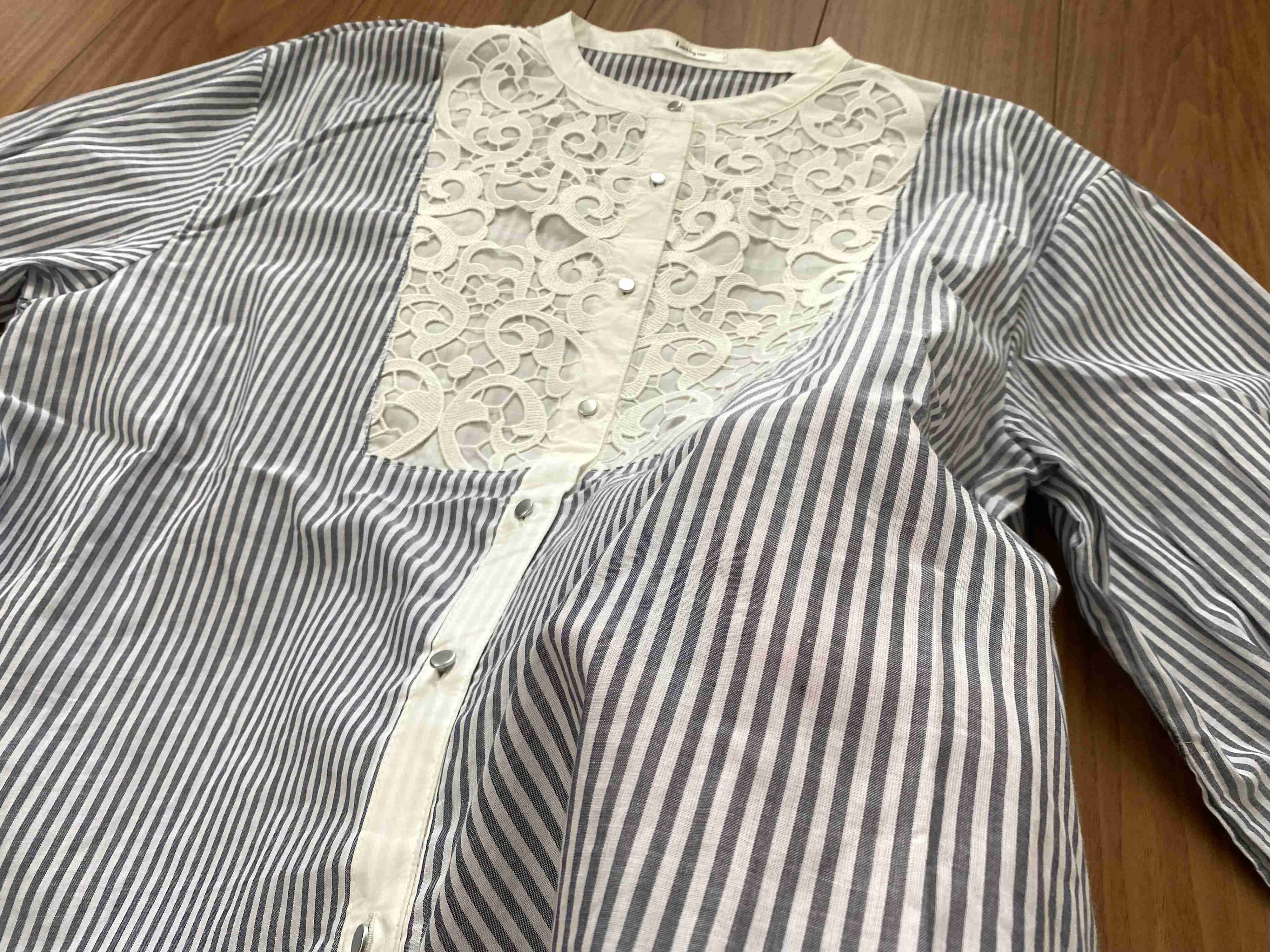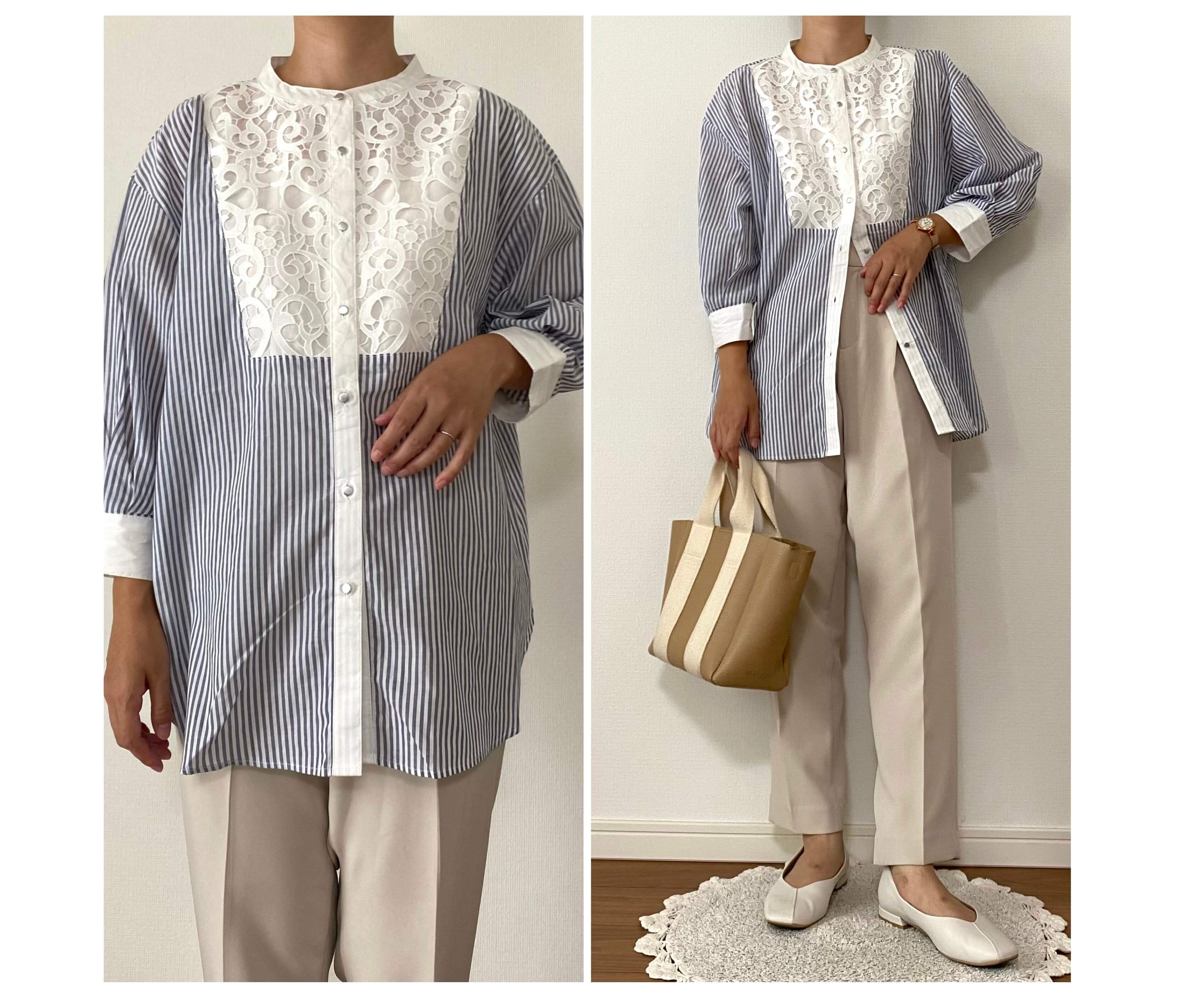 今回はプチプラなのに高見えで上品なデザイン。シャツですが透け感のある生地でまだ蒸し暑い今から着られるレースストライプシャツをご紹介します。