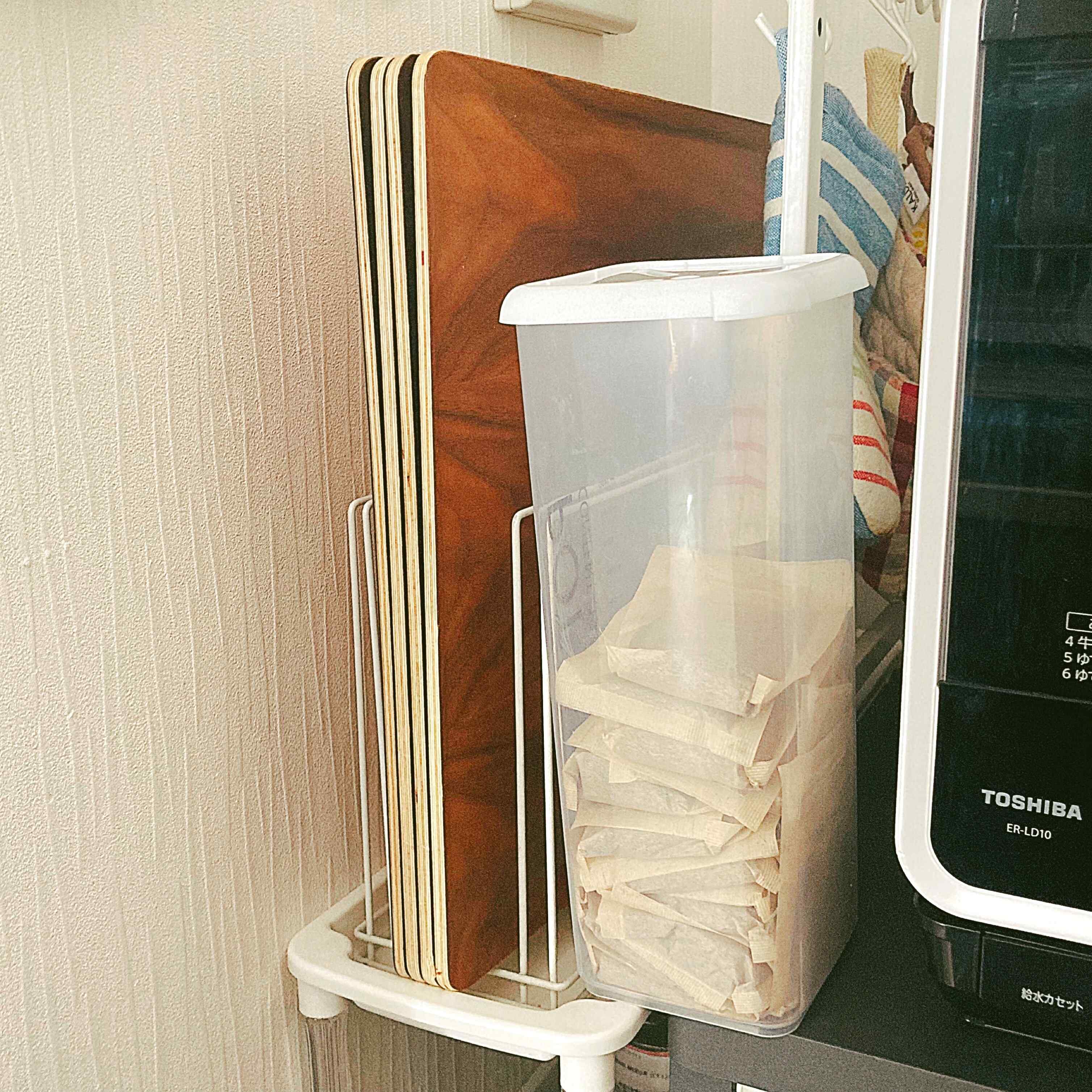 高さのあるメリットを活かして縦長のものを収納するのに大活躍しています。