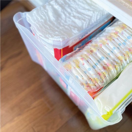 オムツや掃除用品など、我が家では買った商品パッケージをそのまま活用!収納用品を使うとなると、モノと収納用品のサイズを調べてそれに見合う商品をリサーチしたりお店へ買いに行ったりと時間もお金も体力もかかります。
