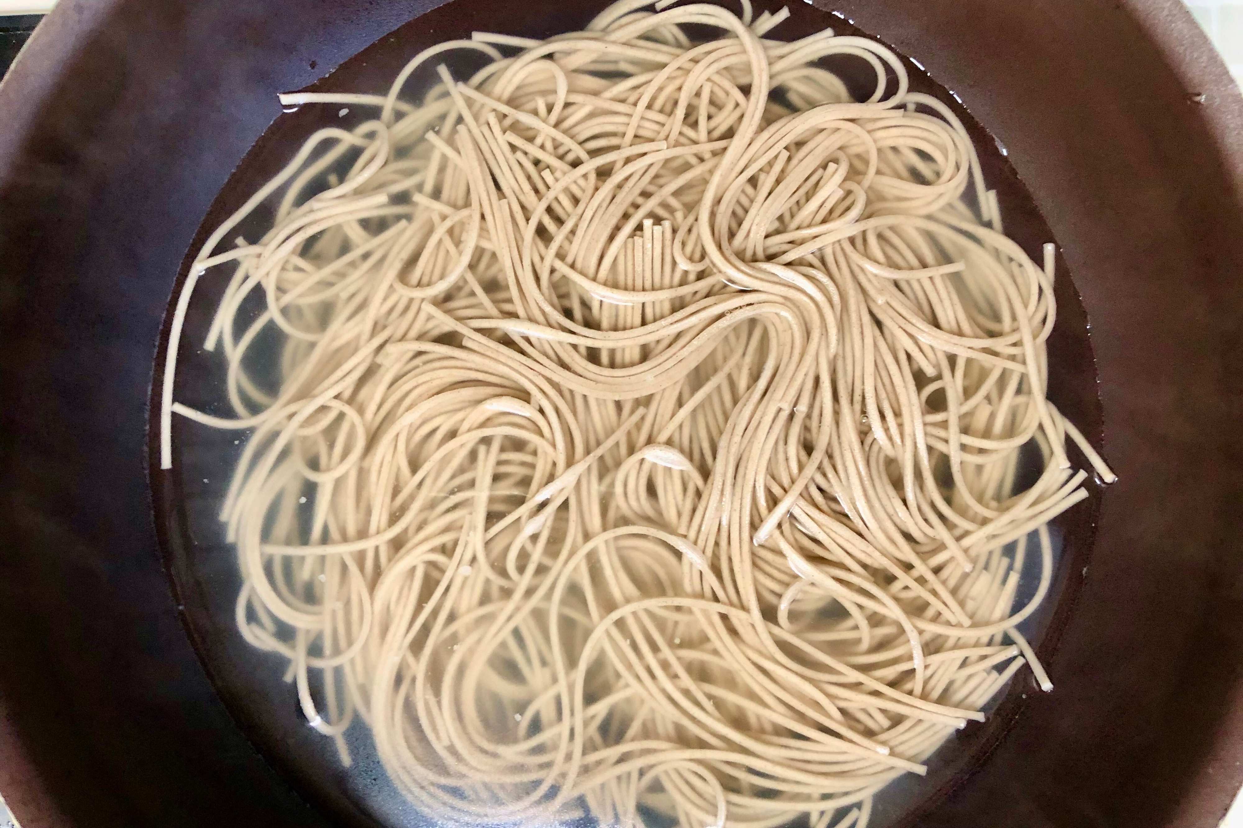 ただ、人数が多いとレンジのほうが手間がかかるため、わが家ではお蕎麦を茹でるとき「麺が出ないすれすれ程度のお湯」しか入れずに「ズボラ茹で」をしています。
