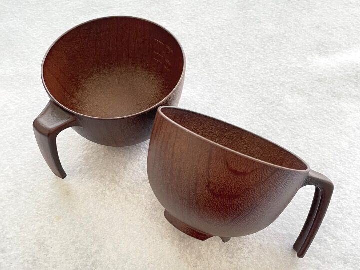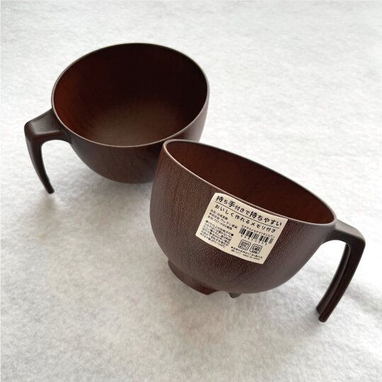 持ち手が特徴的な木風仕上げの汁椀です。使ってみると、便利なポイントがいくつもあり「買ってよかった」と大満足できるアイテムです。