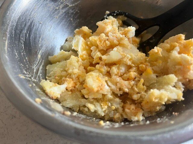 今回はじゃがいもとゆで卵も合わせます。ゆで卵もいっしょにじゃがいもとつぶしていきます。