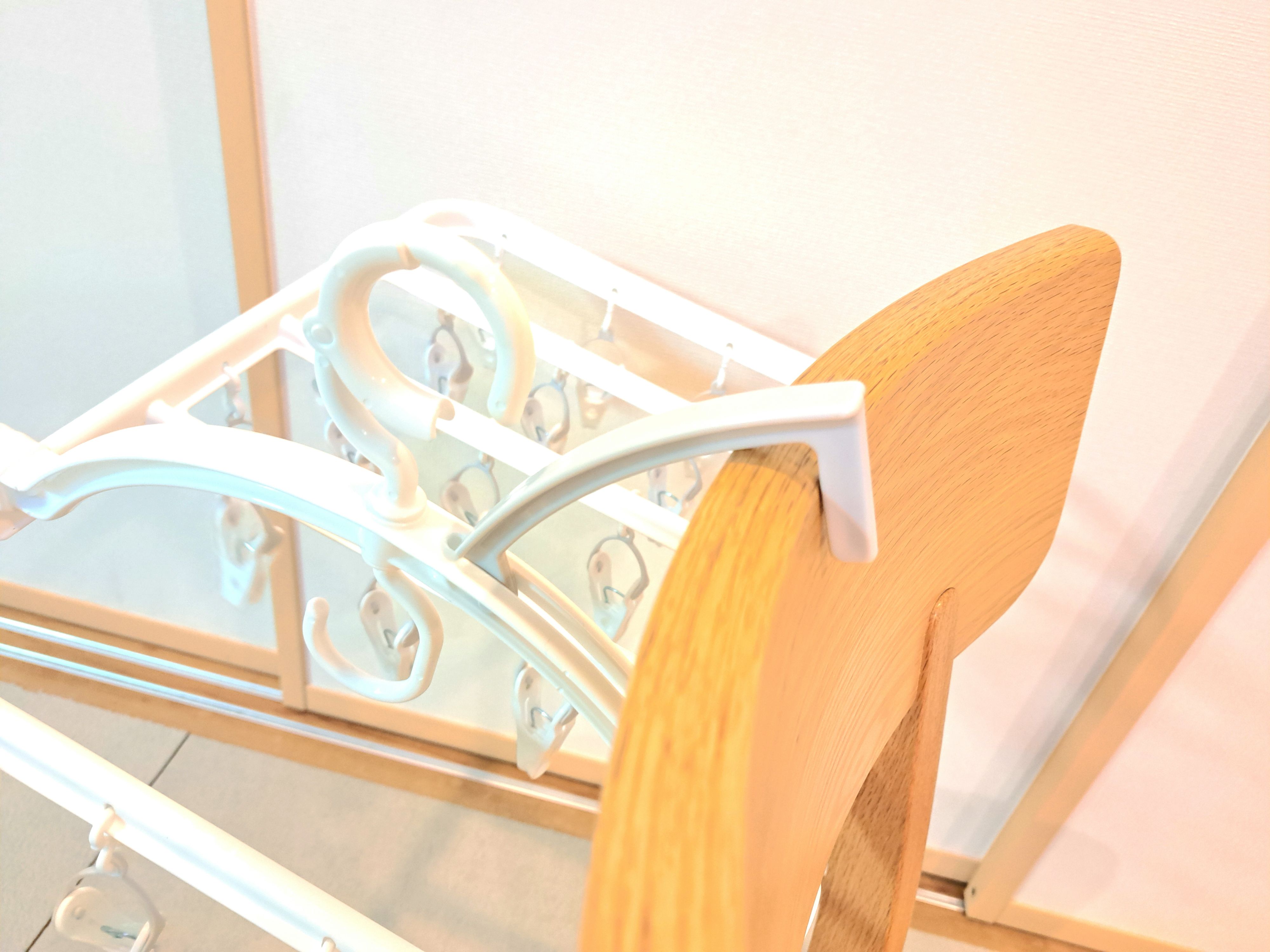 ドア・かもいかけフックがあるおかげで、1階での部屋干し時に椅子にかけて使えるようになりました。これは私にとってとてもうれしいポイント。本当はかもいにかけて使いたいのですが、わが家のふすまが2メートル越えのロングサイズなのでかもいにかけたくても届かないんです。なので自由に動かせる椅子にかけて、暖房の風があたるところに置いて乾かしています。