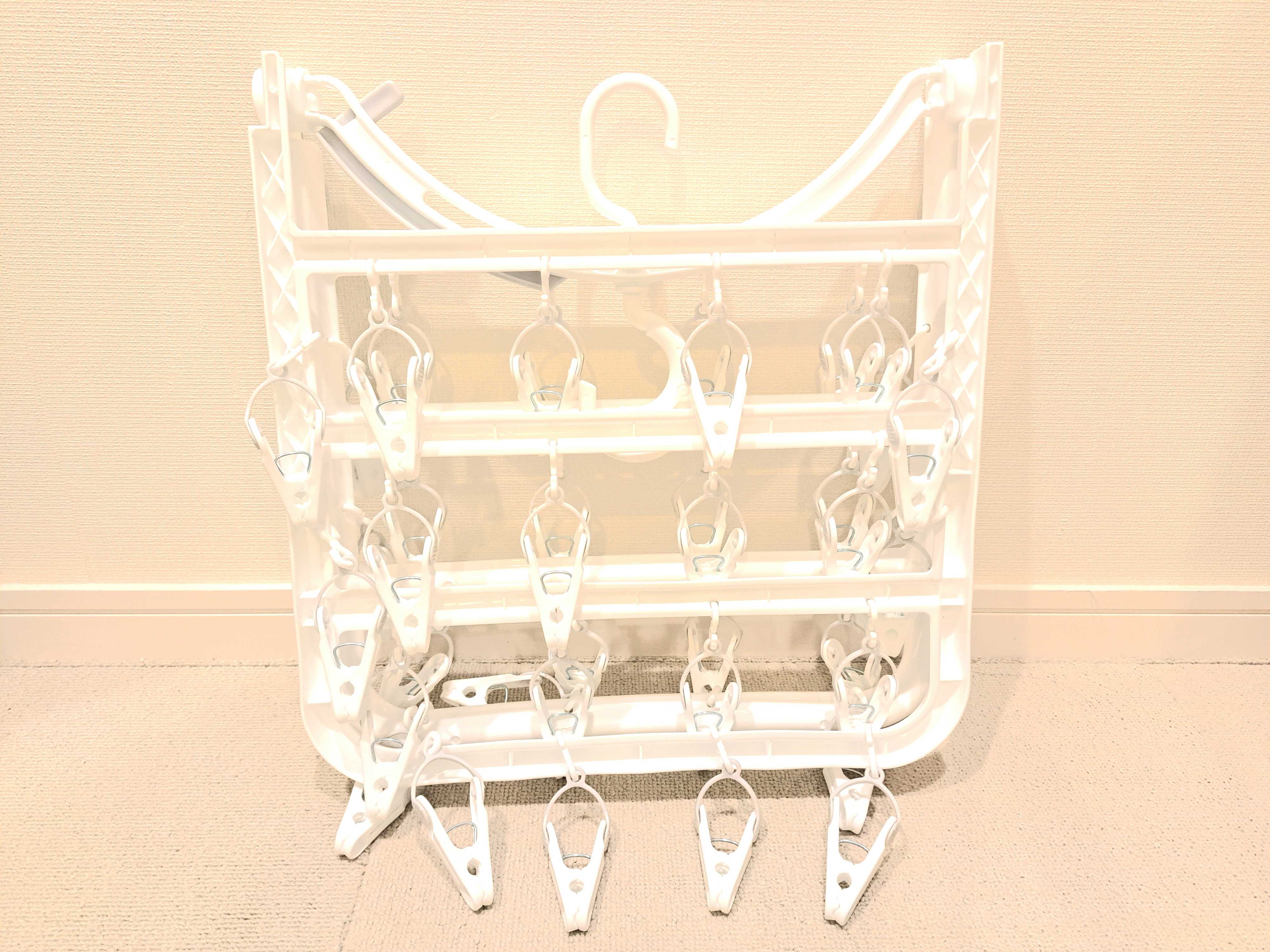 すると、それはそれで、今度は外干しのときと違って干し竿のようにかけられる場所がないので干し方がむずかしいという問題が発生。靴下や下着を干すためにいつも使っていたピンチハンガーをかける場所がない!そんな悩みをニトリの神商品が解決してくれました。