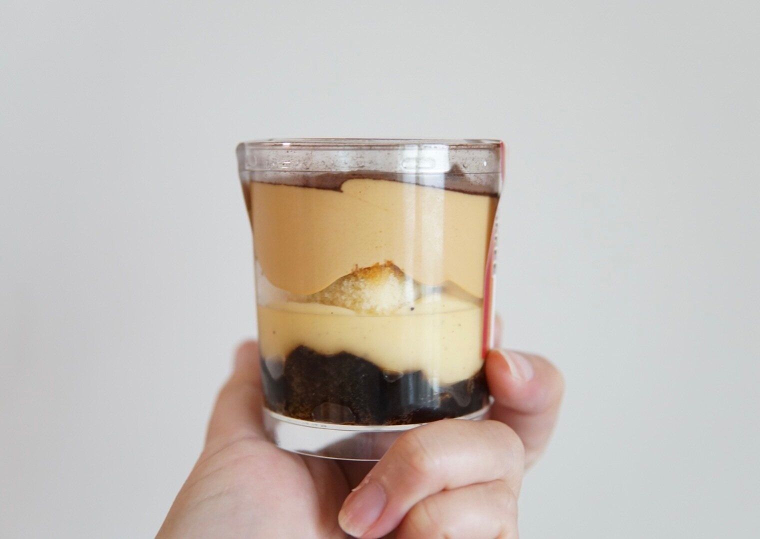 下からほろ苦珈琲ジュレ、カスタードクリーム、ホワイトチョコクランチ、スポンジ生地、キャラメルホイップ、上にはココアパウダーが。上から見るとティラミスのようで、横から見ると様々なブラウンの組み合わせが美しく、とても美味しそうです。