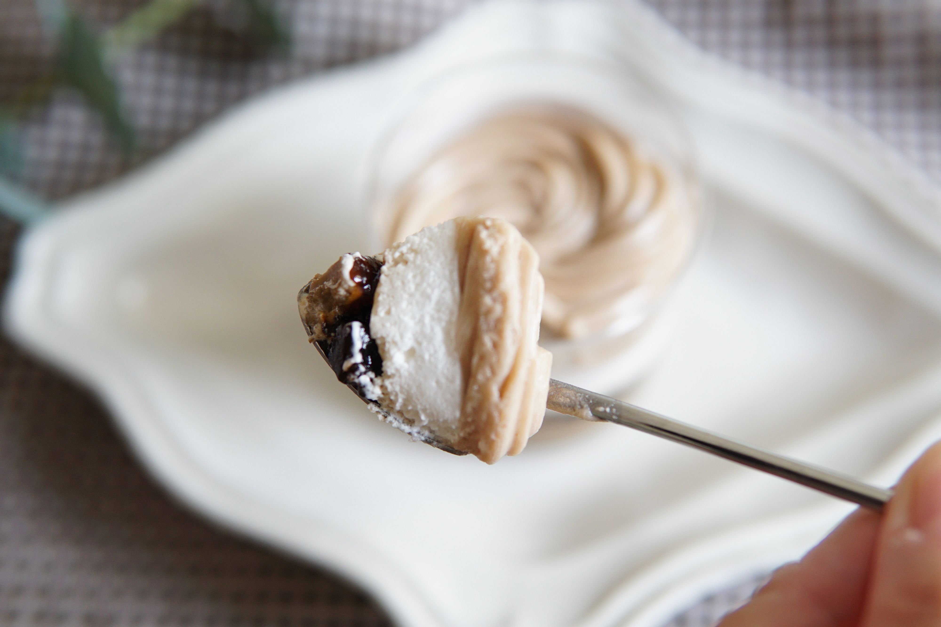 一番上にあるマロンクリームと、一番底にある珈琲ほうじ茶ムースに和スイーツ感があります。特に珈琲とほうじ茶という、ドリンク同士をかけあわせたムース、この発想が面白いですね。珈琲の苦みも感じられるほうじ茶といった味がしました。また、原材料を見ると、白こしあんの文字。あんこが入っていることで、より、和の雰囲気が強まっているのかなと感じます。