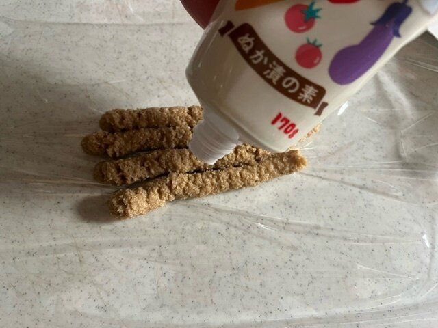 よく洗った野菜をこのぬかチューブをしぼり出してラップで包むだけ!