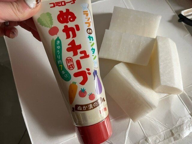 大根をちょうどいい大きさにカットして、ぬかチューブをしぼって大根を包みました。