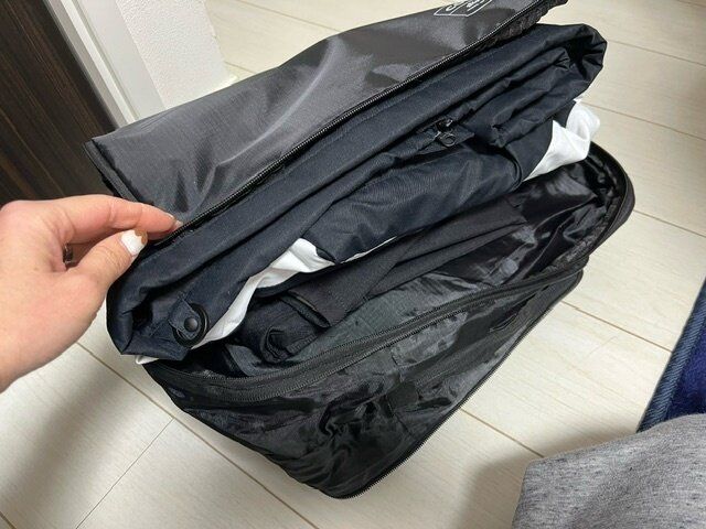 真ん中のファスナーはまだしめていませんが、結構厚みがあります。このままスーツケースに入れると