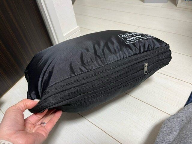 こんなに簡単に小さく圧縮されるのは便利!実はこれまではビニールの圧縮袋を使用していました。