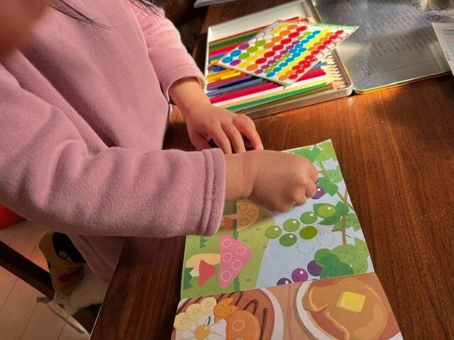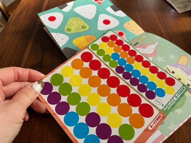 絵の中に丸が書いてあり、ここにシールを貼っていく感じです。これなら子どもでもできそう。