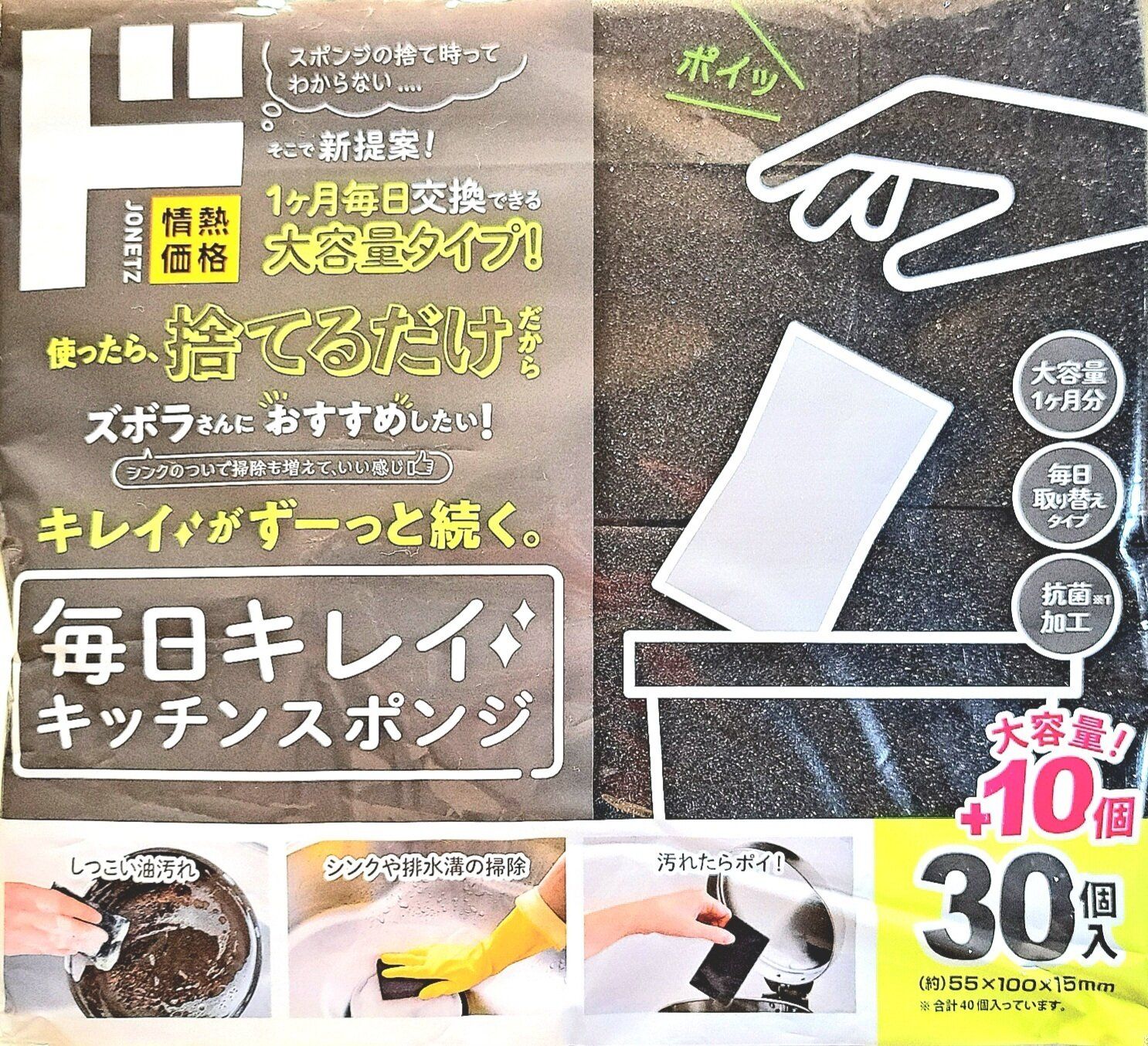 毎日使うものだからこそ、清潔にしておきたいスポンジ。最近は1回使い切りタイプのものも多くありますが、私がおすすめするのはドン・キホーテで販売されている「毎日キレイキッチンスポンジ」です。大容量40個入りで価格は328円。1枚あたり10円以下という高コスパアイテムです。