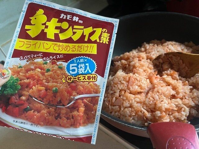 おいしい!今回は具材にハムのみしか入れませんでした。味付けも少しだけ塩コショウをしましたが、あとはこの「チキンライスの素」のみ。でも、しっかり味が付いていておいしい。