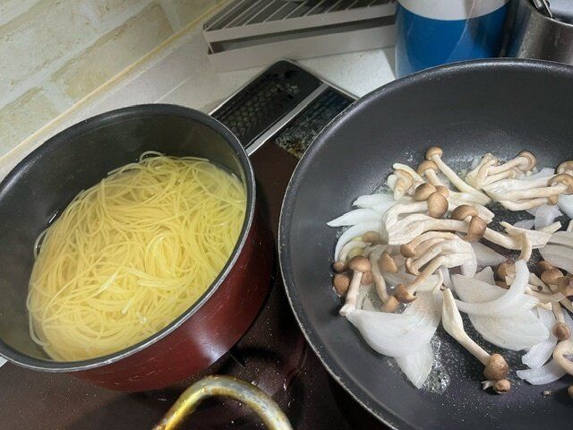 チキンライスと同様にフライパンでタマネギやきのこ、ソーセージなどの具材を炒め、そこへ茹でた麺を入れました。そして、「チキンライスの素」を入れて炒め混ぜるだけ。