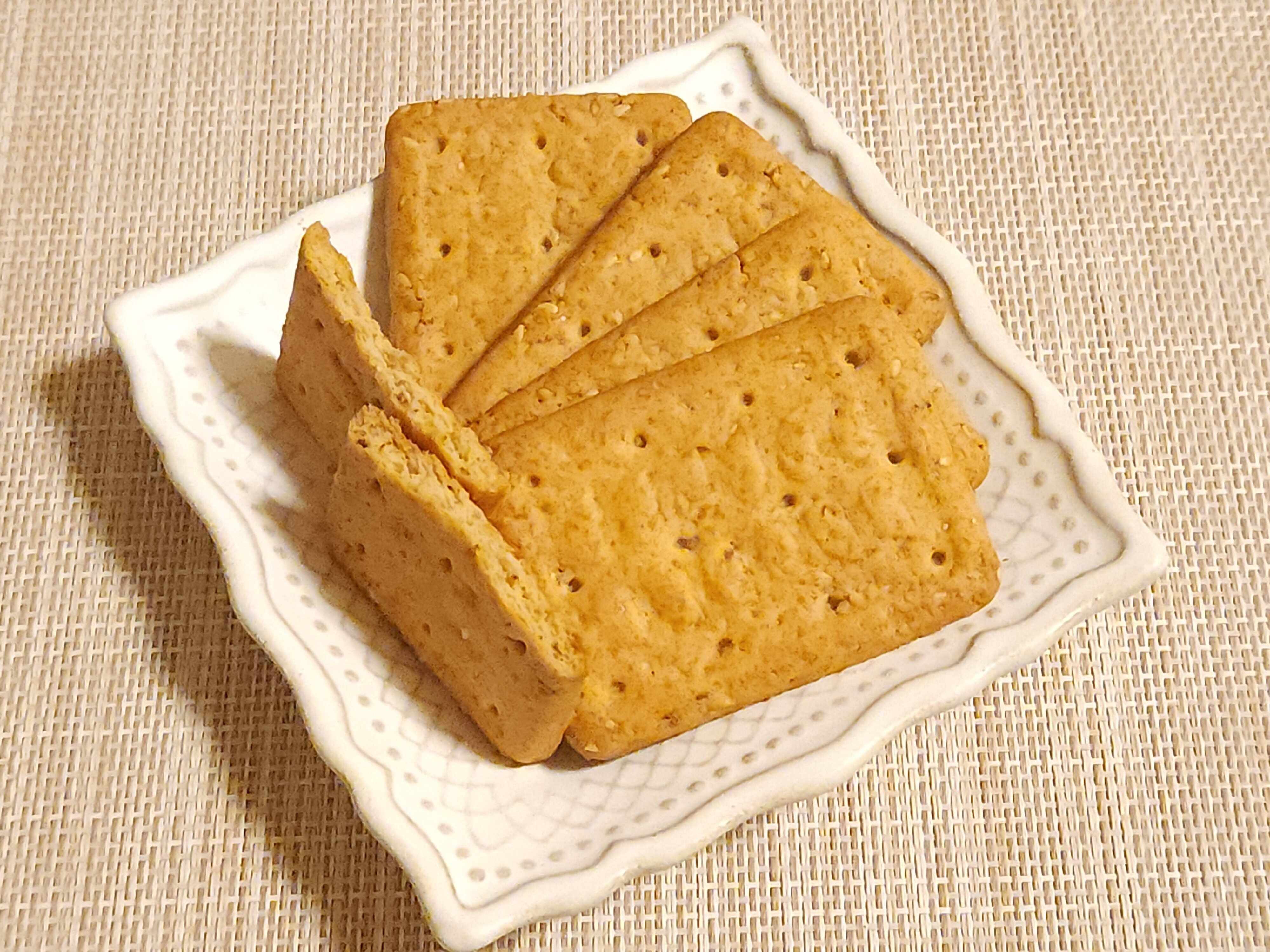 ビスケットにはゴマもたっぷり入っていて、サクッとした食感の後にゴマのプチプチとした食感も感じられます。食べると口の中にゴマと小麦の香ばしい風味が広がります。香ばしくて程よい甘さ、軽い食感で手がとまらなくなりそうなおいしさですが、1枚あたり約50kcalあるので、食べすぎには注意です。