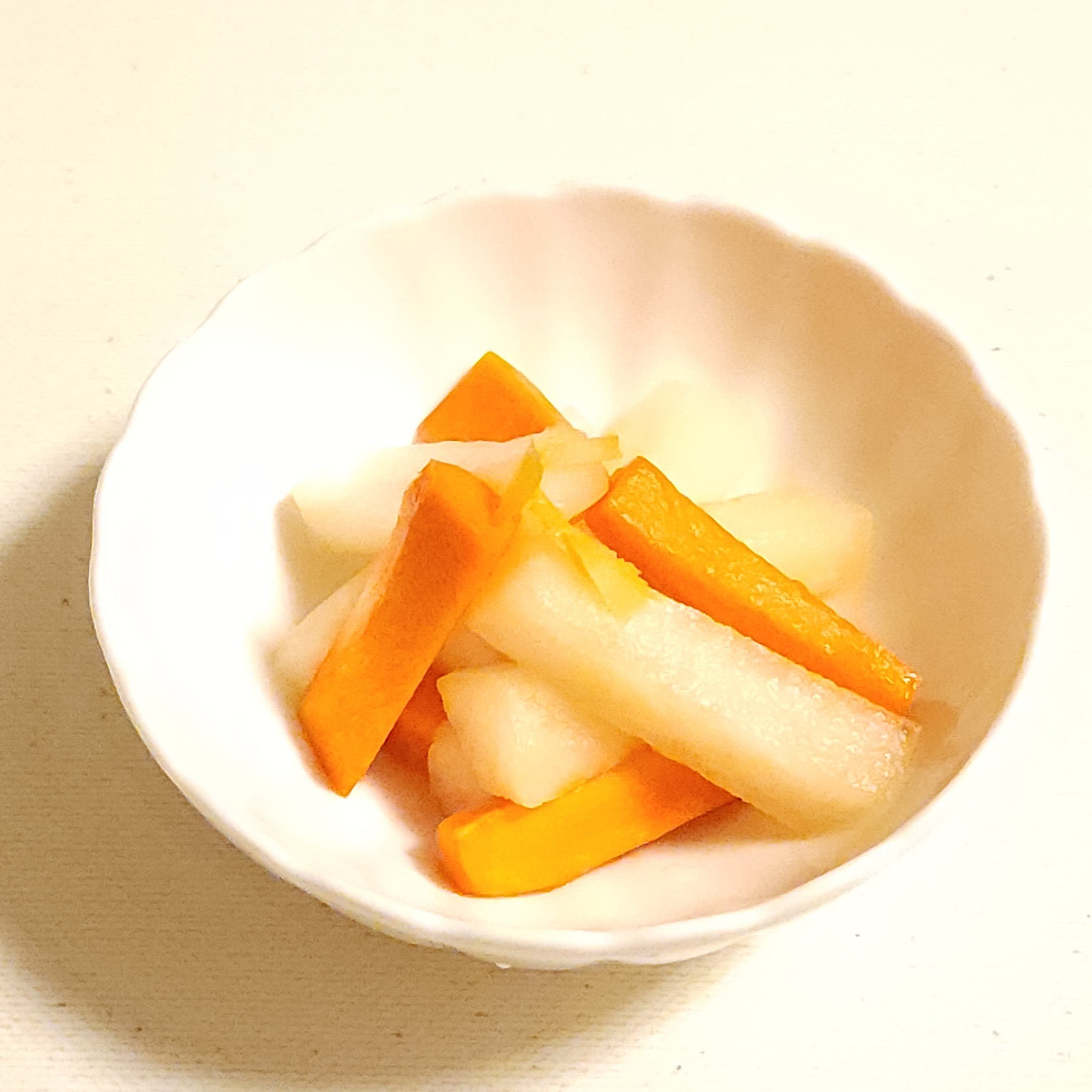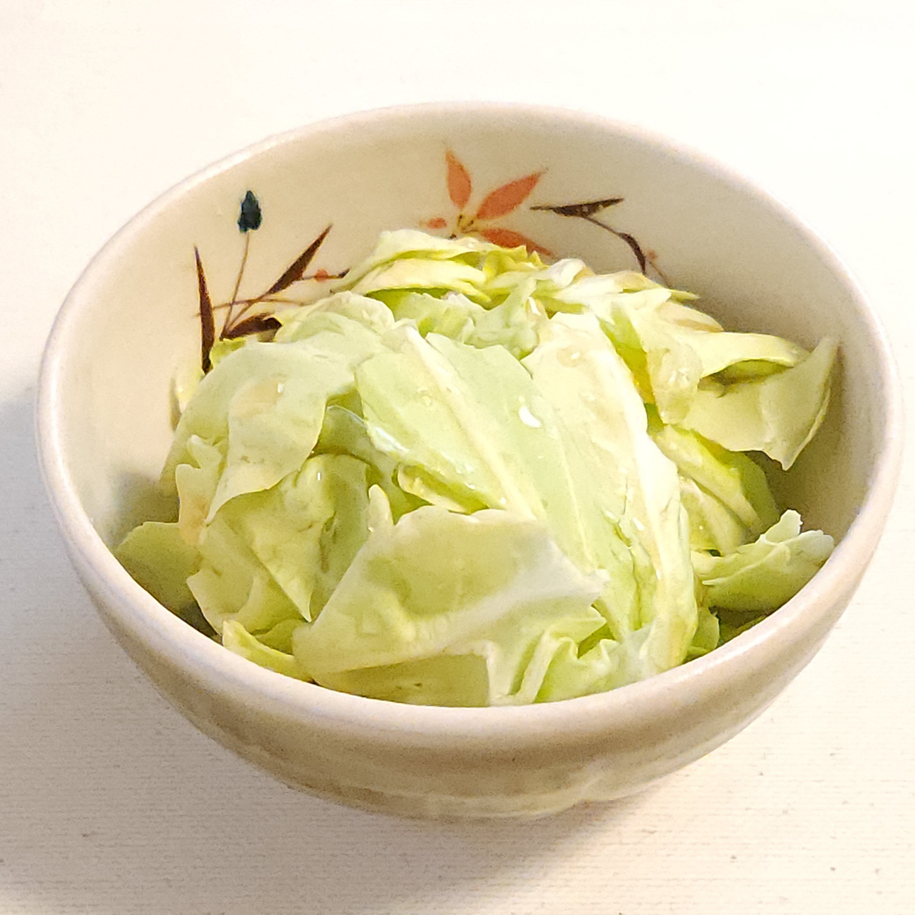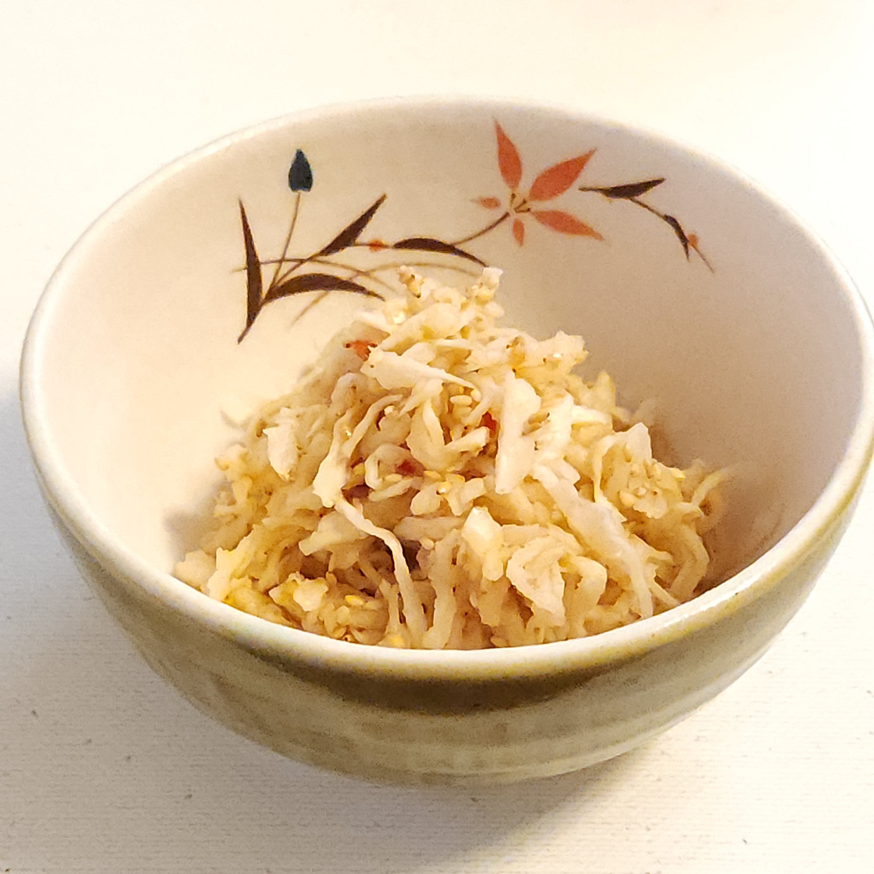 切り干し大根20gを水で戻した後に水気を切り、キャベツのうまたれ(大さじ1)、ごま油(小さじ1/2)、豆板醤(少々)を混ぜ合わせたものをからめて、お好みでいりごまをかけると、切り干し大根の中華風和え物ができあがり。