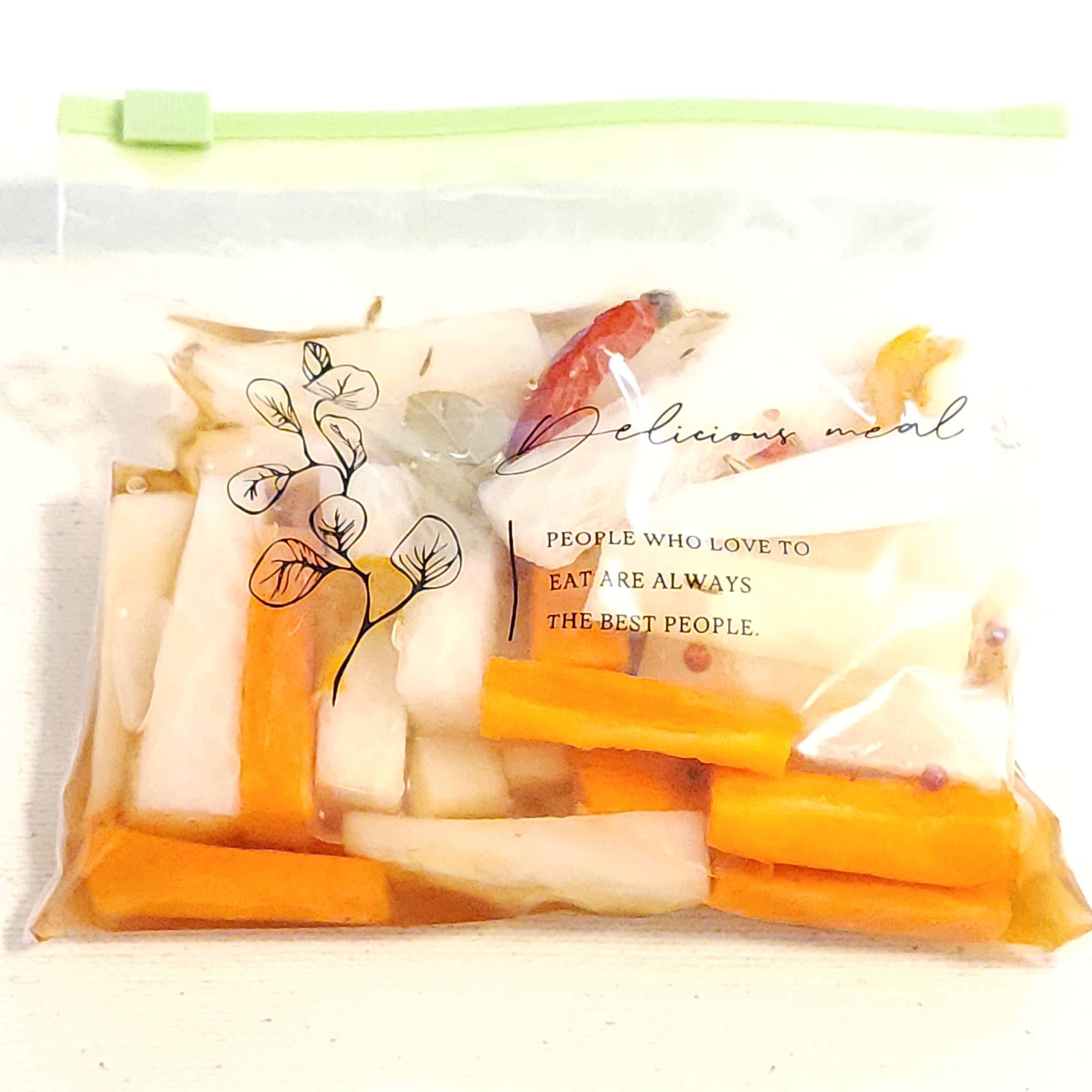また、食べやすい大きさに切った野菜とキャベツのうまたれ、唐辛子(1本)、ローリエ(1枚)、ピンクペッパー(少々)、フェンネルシード(少々)、柚子ピール(少々)を冷蔵または冷凍できる保存袋に入れて5時間程度漬けるとおいしいピクルスができあがります。キャベツのうまたれだけでも浅漬けができますが、ローリエや唐辛子、好みのスパイスを少量加えるとより華やかな味わいになります。