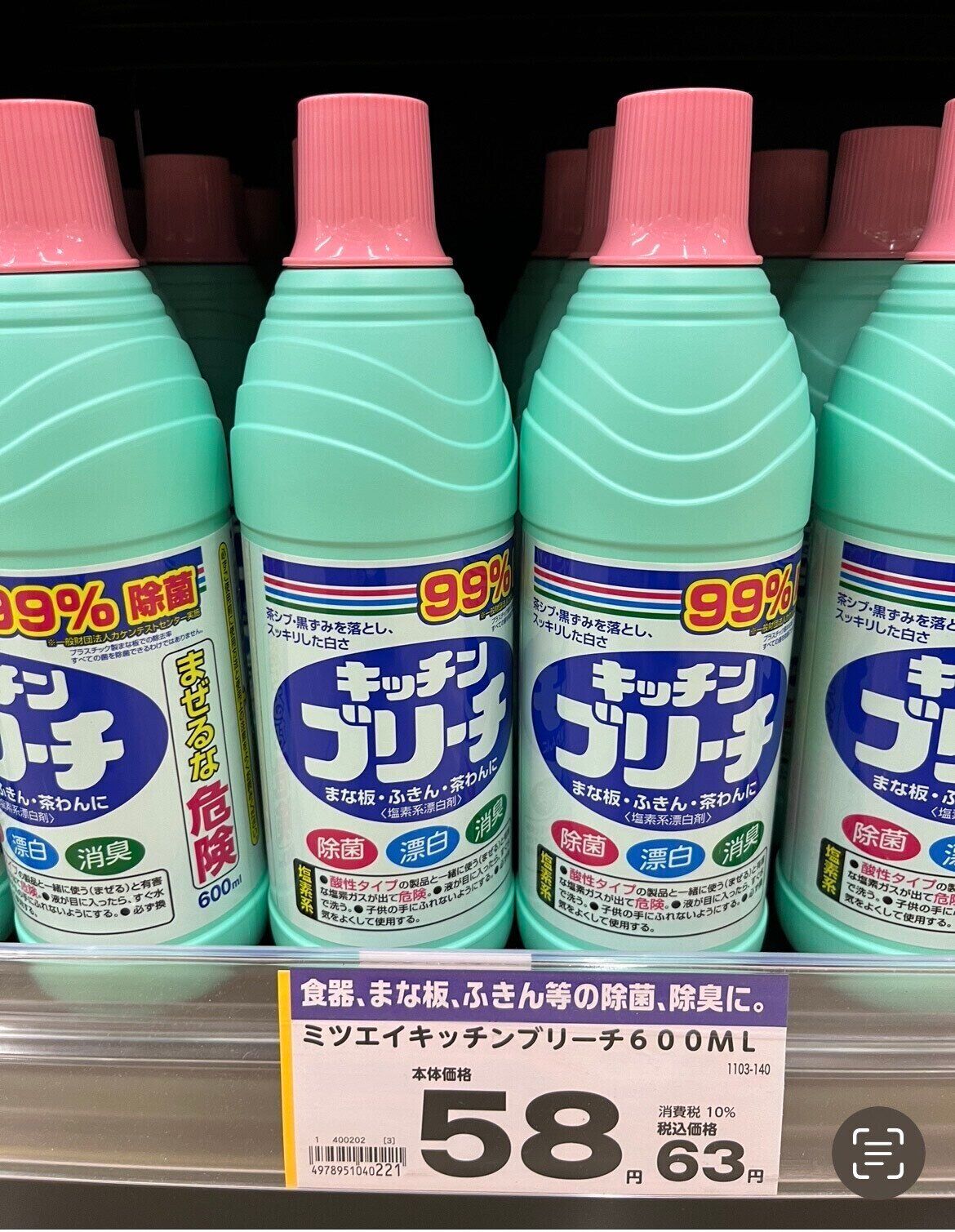 食器の茶渋・衣類の黄ばみの漂白や消毒など用途多数の塩素系漂白剤。