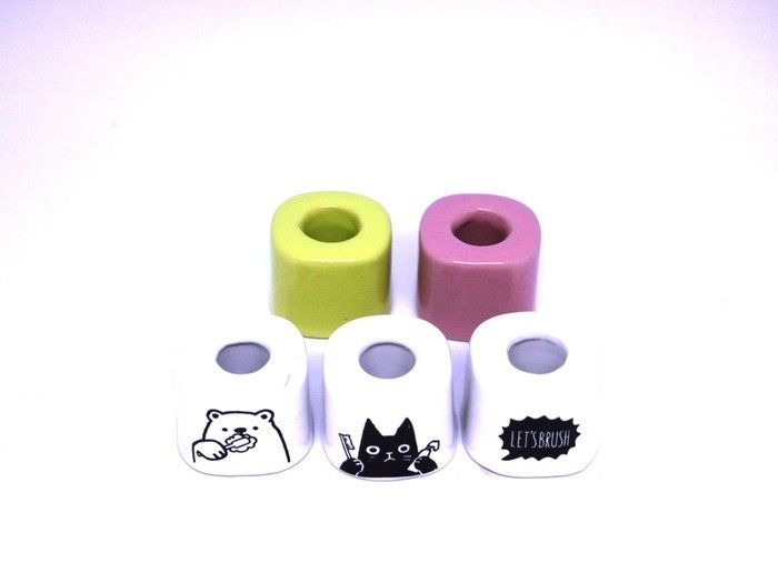 歯ブラシを1本ずつ立てて収納できる歯ブラシスタンド。小さくてころんとしたフォルムがなんともかわいく、最近人気のアイテムです。好きな色や絵柄を選んで、家族人数分を並べると見た目も楽しい! 歯ブラシスタンドというと、水アカが溜まりやすく洗いにくい物も多いですが、これはいたってシンプルな作りなので、水でサッと洗い流せていつでも衛生的。歯ブラシを手に取るときでさえ、楽しい気分になれそうです。