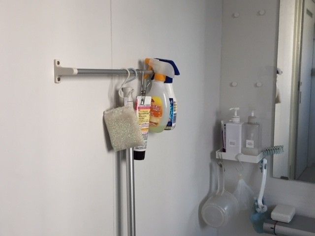 鏡の横にはもともと棚が3つありましたが、2つは自分で外し、使っているのは一番下の棚のみ。ここにシャンプー、ボディソープなどを置いています。泡立てネットや風呂桶はフックで吊しているので、使った後も水気が残りにくくいつでも衛生的。壁面のポールには、主に掃除用具を吊して収納。