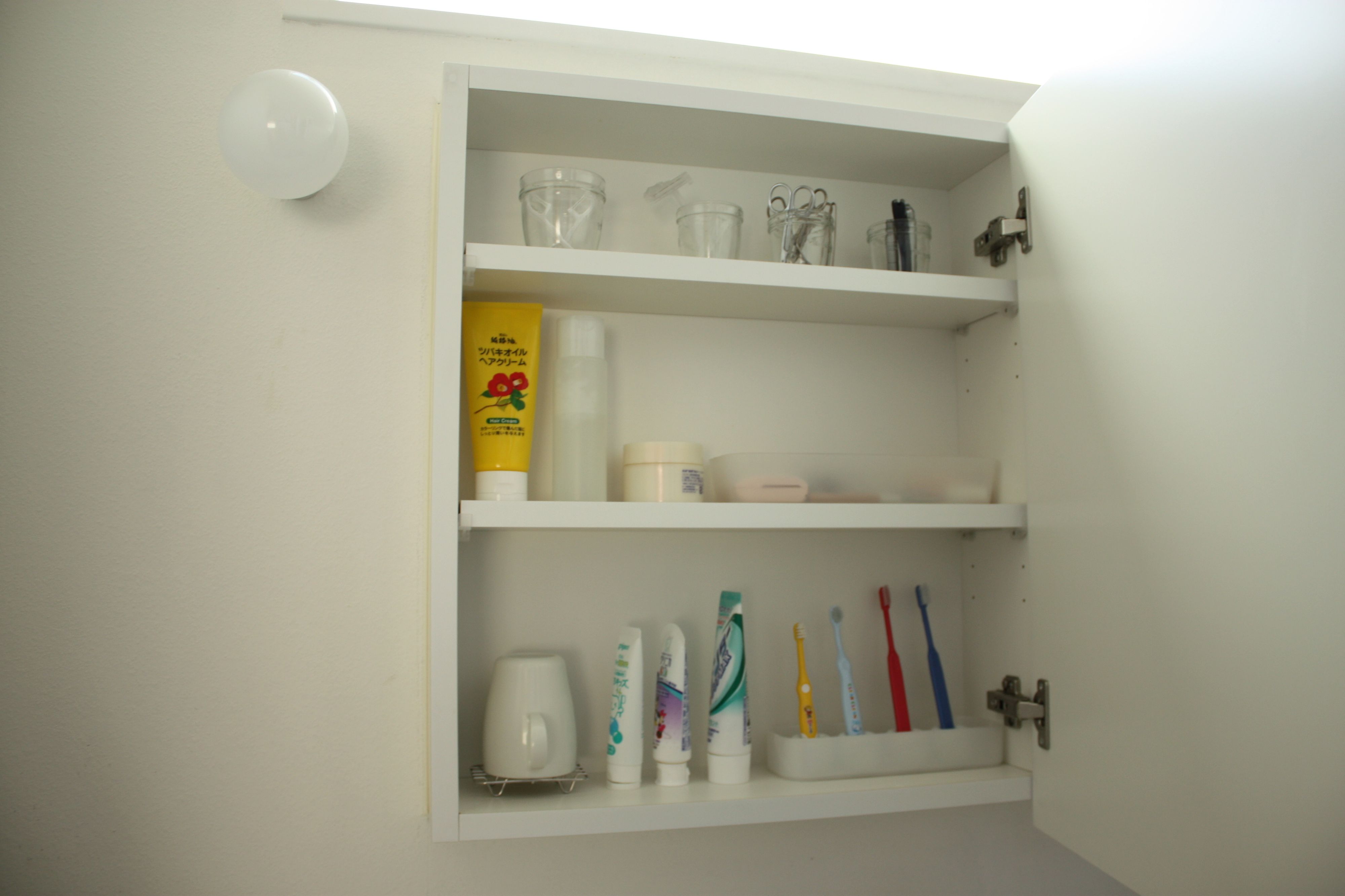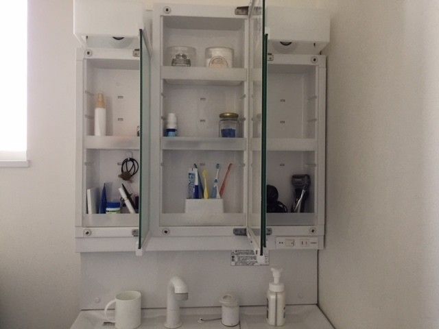 MIINAさんの洗面所でも、鏡裏の収納スペースに歯ブラシやスキンケア用品が整然と並んでいます。