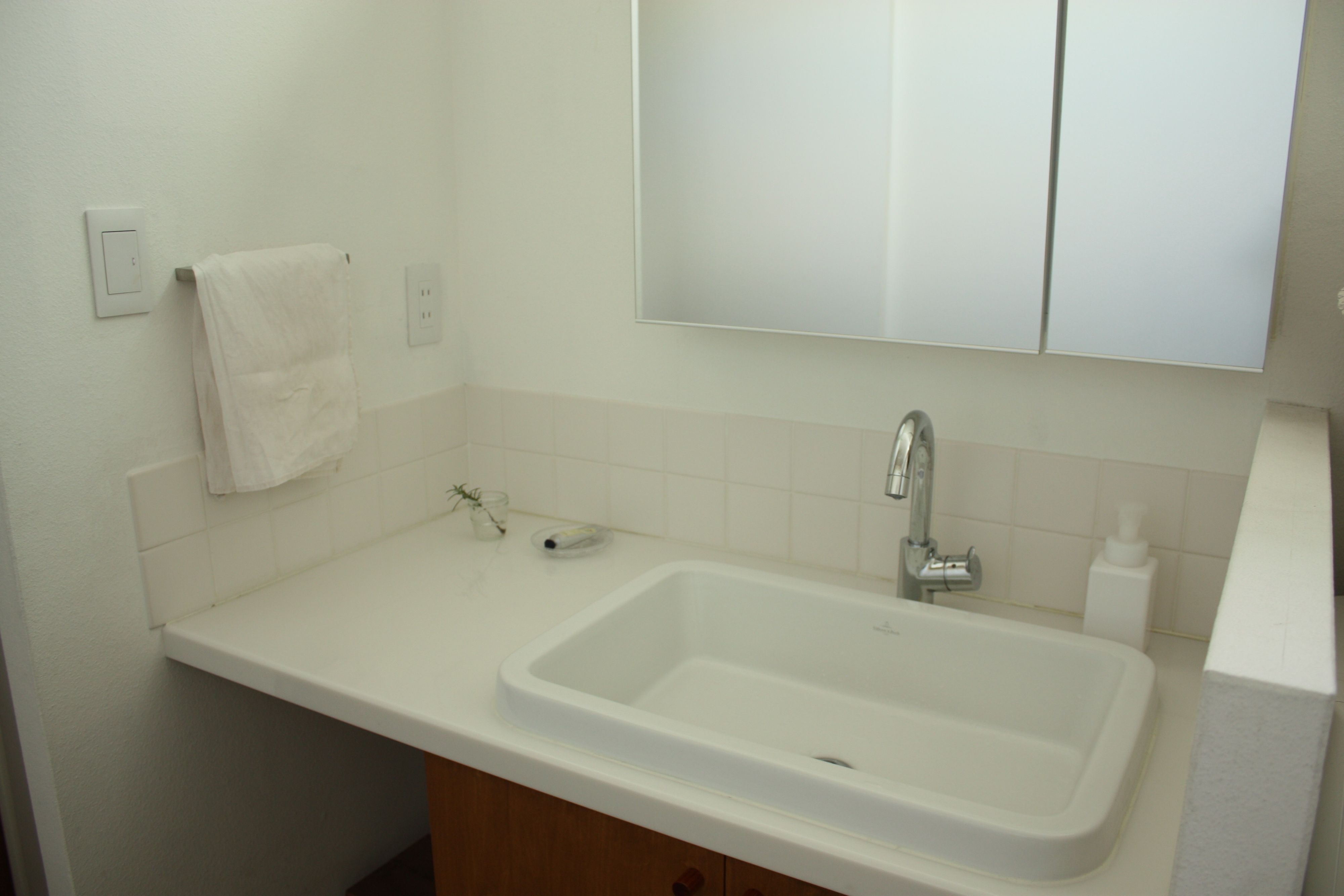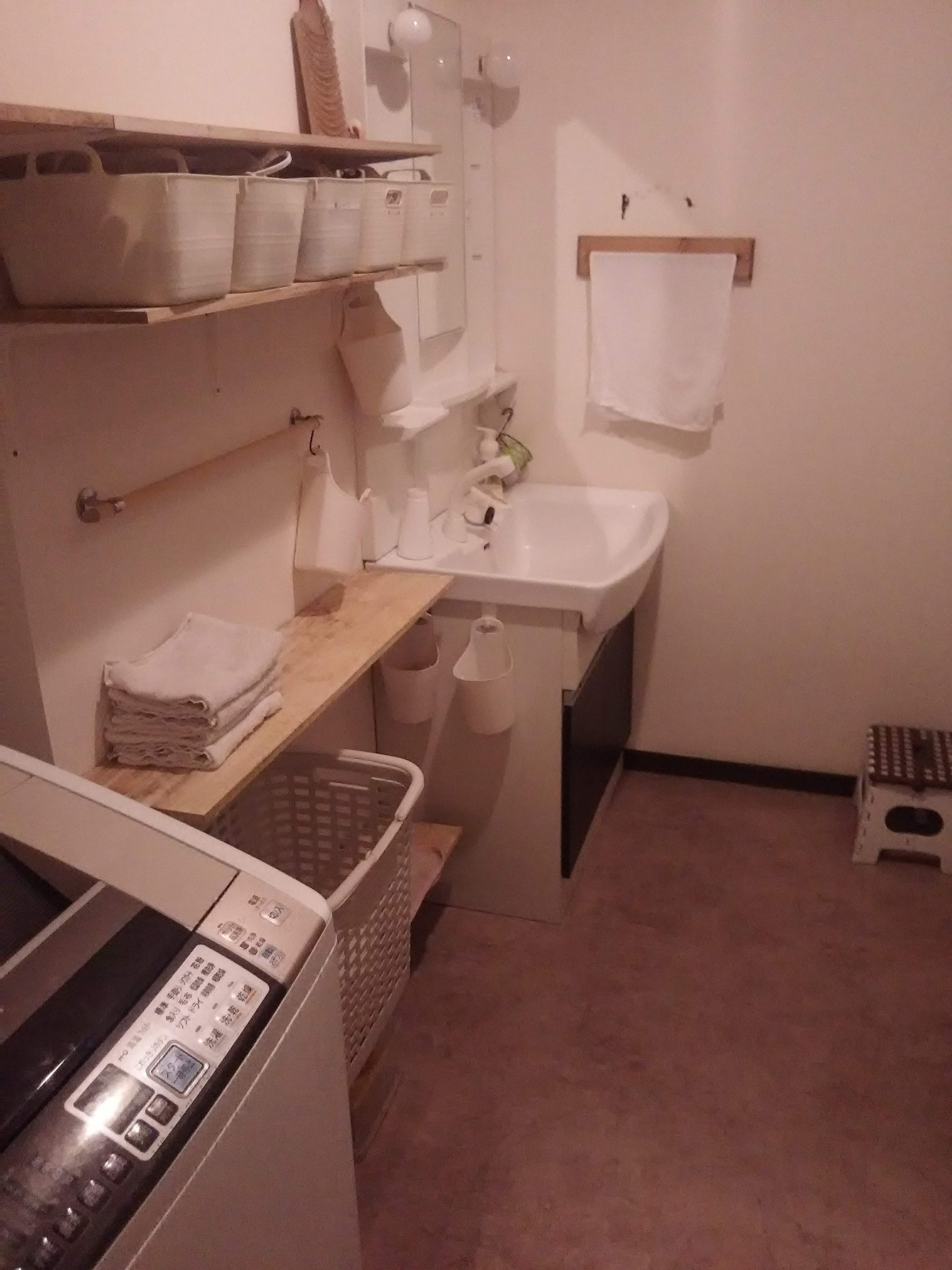 そんな洗面所の掃除はいたってシンプル。洗濯機に入れる前の使用済みタオルを活用し、鏡やシンクを拭き取っているそう。気になる汚れは使い古した歯ブラシでこすって落とします。