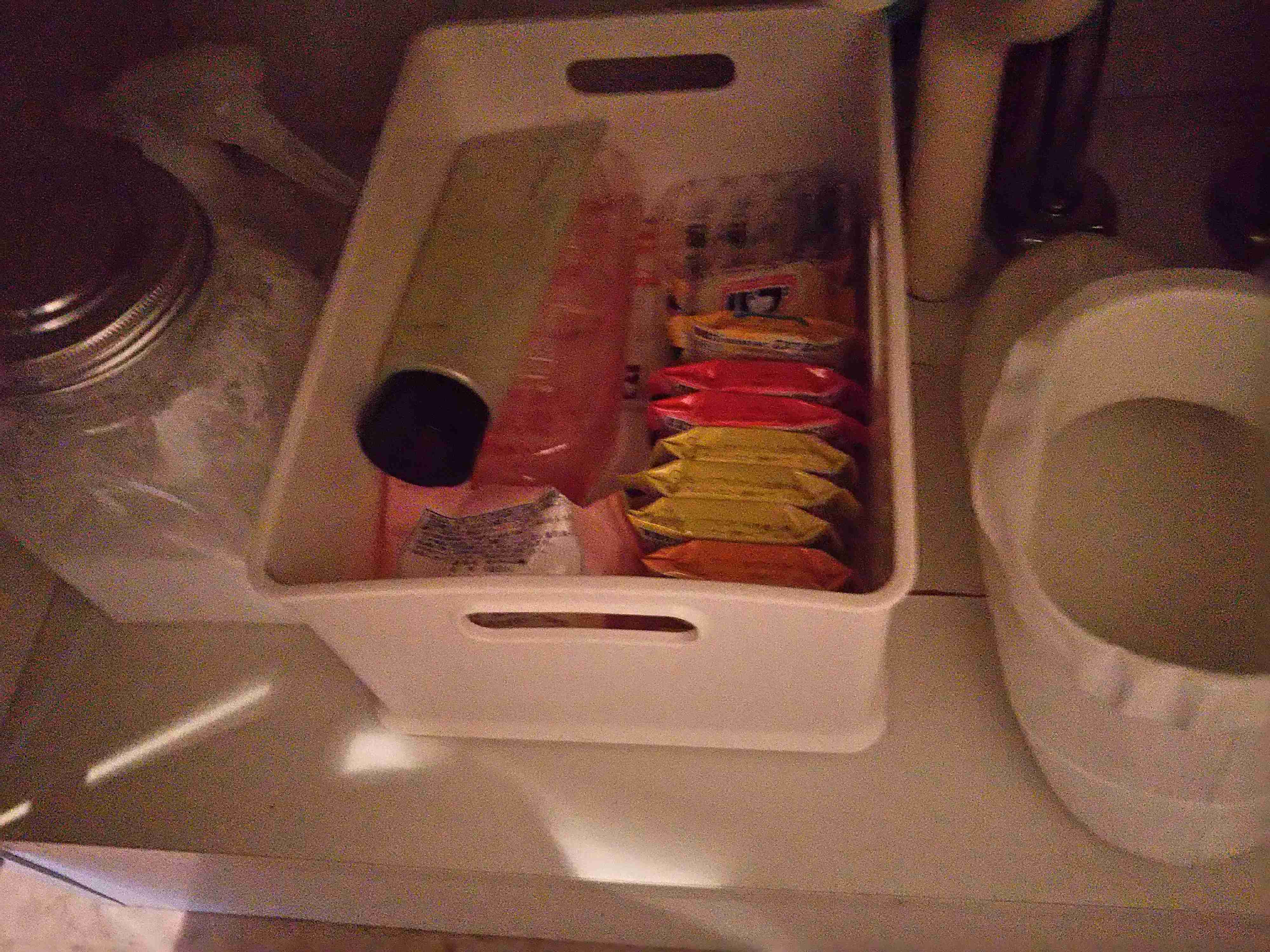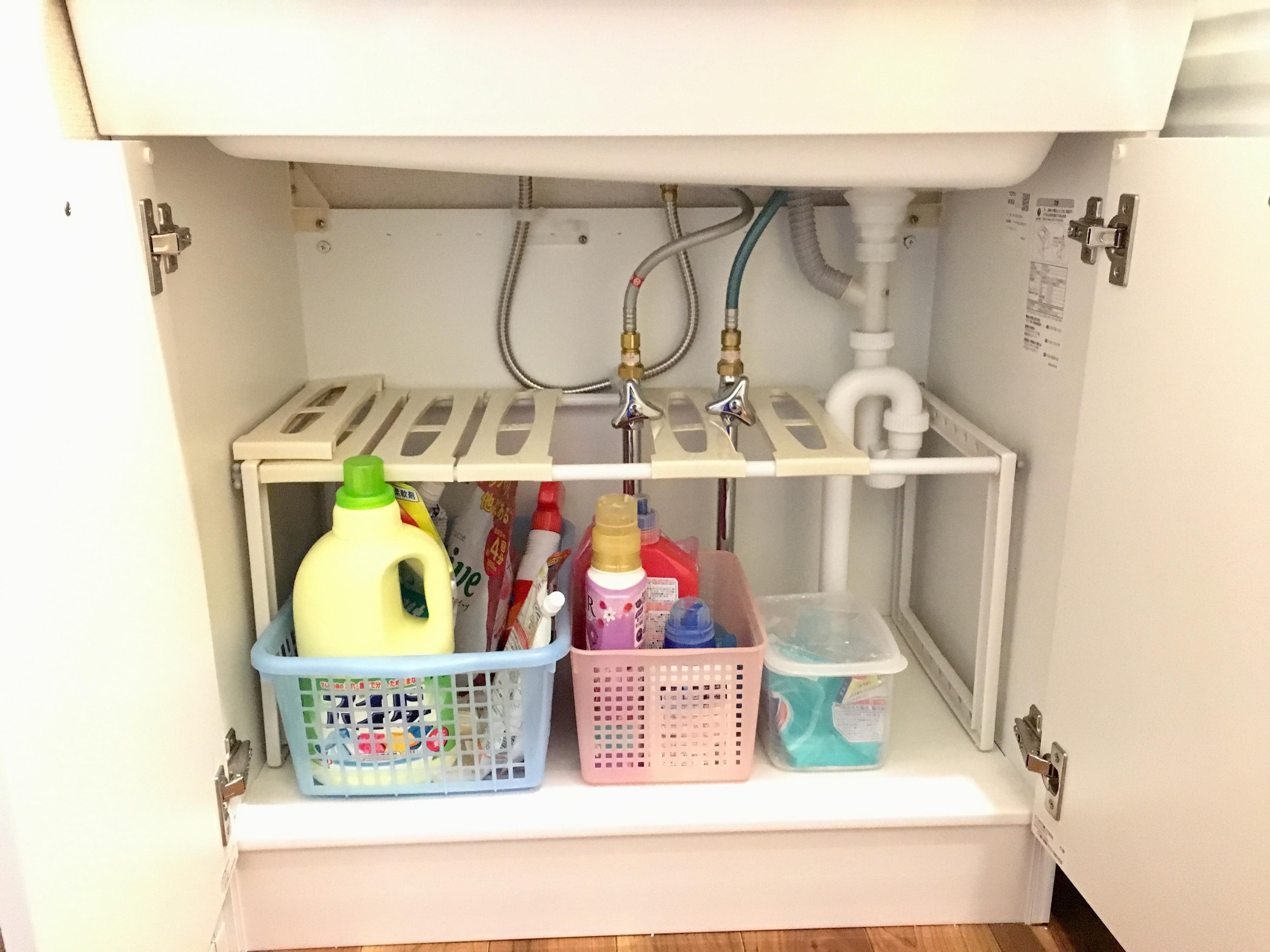 comayoさんの場合、洗濯用洗剤や柔軟剤、シャンプーなどのストックをひとつのカゴにまとめて、シンク下に収納。こまめに買い足すのは面倒なので、“なるべく大容量のもの”を買うようにしているそう。ストックの管理は、ときどきこのカゴをチェックするだけでOK!