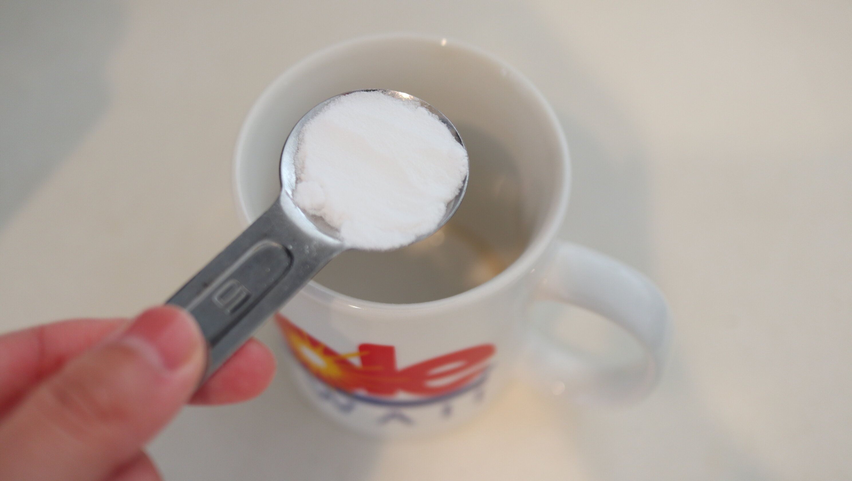 1.茶渋のついたマグカップに、小さじ1杯の重曹を入れる