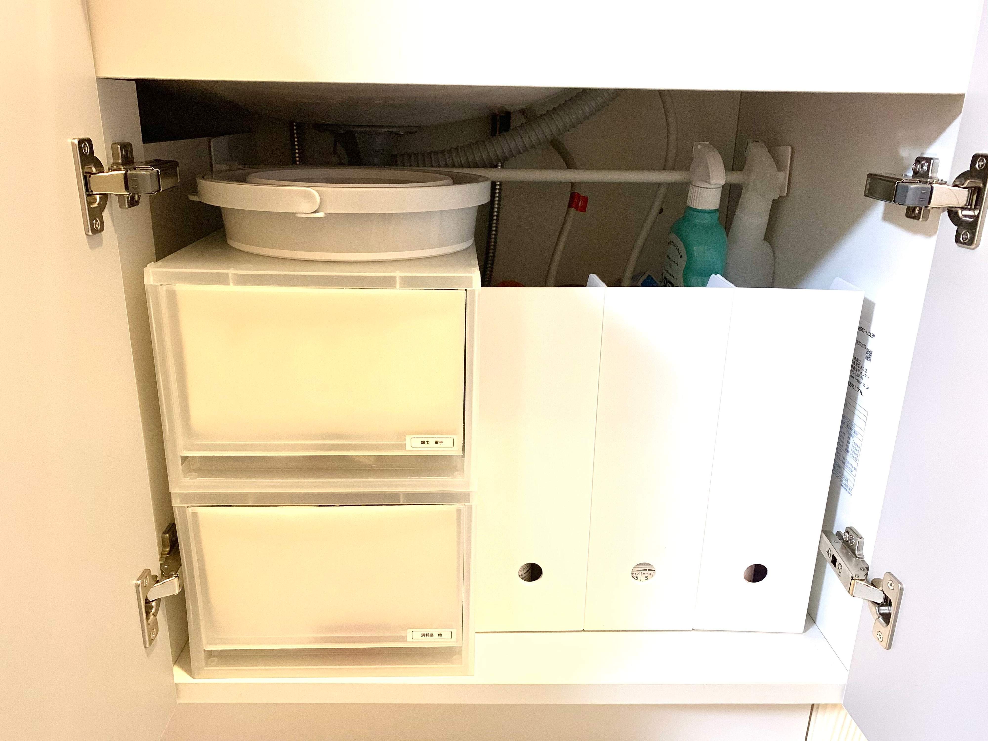 今までは棚の上や、洗面所以外に置いたりしていましたが、コンパクトになったことで、洗面所下に収納することができました。