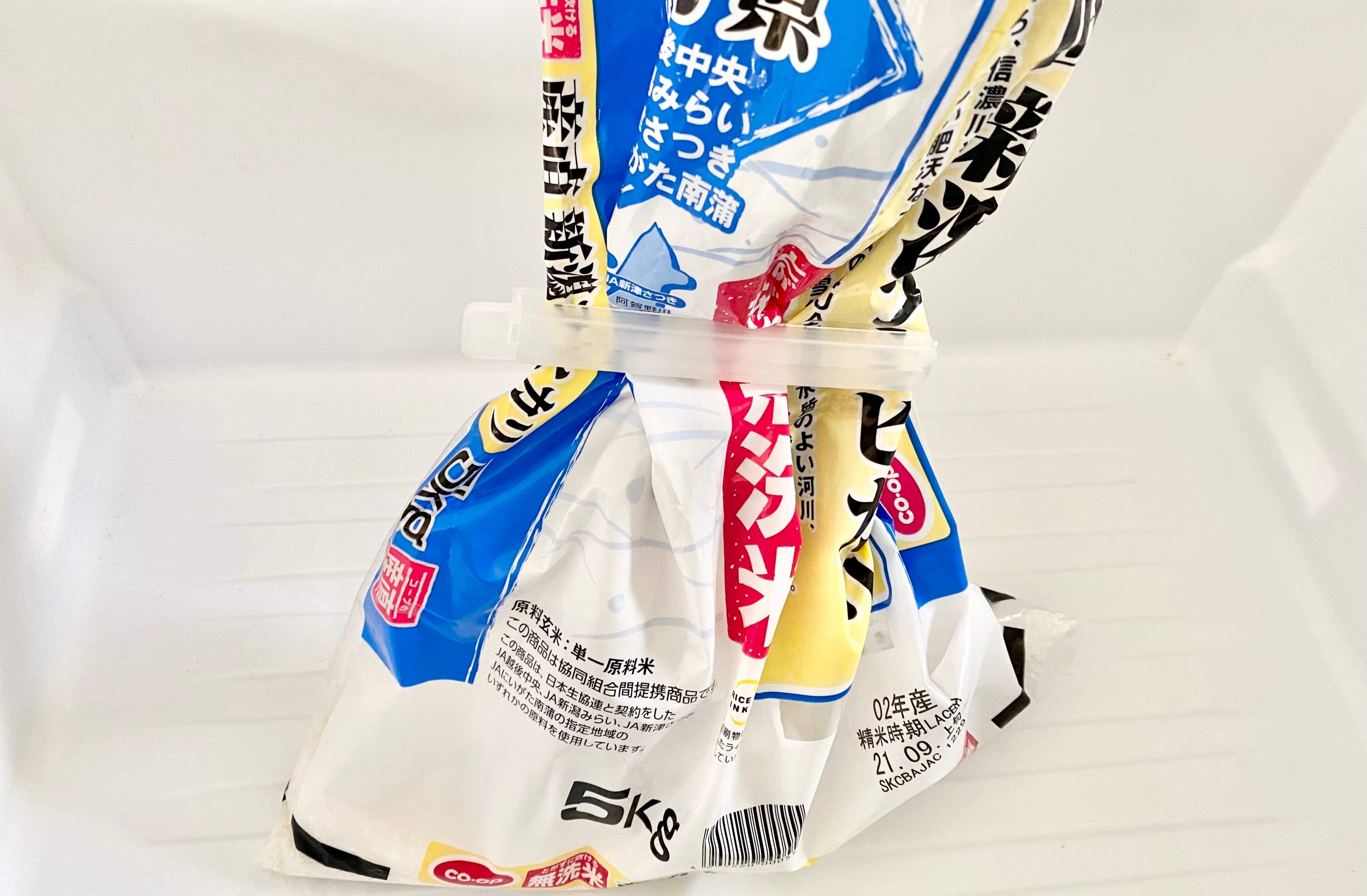 お米の袋の開いた口を、袋止めクリップで止めて冷蔵庫の野菜室に保管。