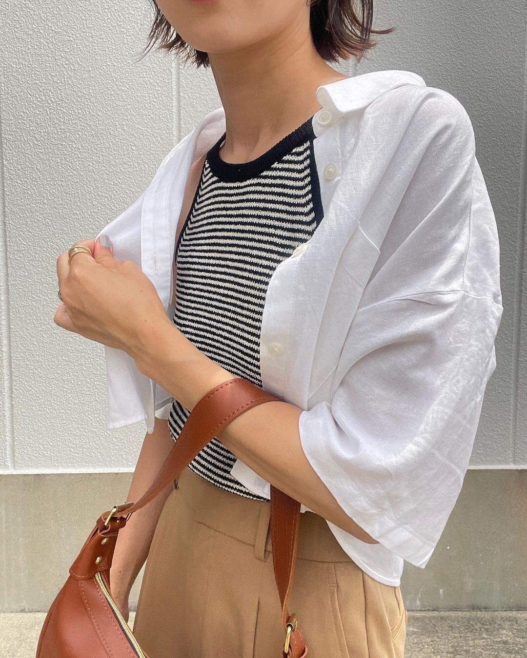 雨の日は、とにかく羽織りものがあると便利。サラッとしたリネンブレンドのシャツは、どんなボトムにも合わせやすい白があると万能です。GUの「リネンブレンドクロップドシャツ/1,990円」はクロップド丈で今っぽさも◎。ボリュームのあるボトムを合わせるとバランスよくまとまります。