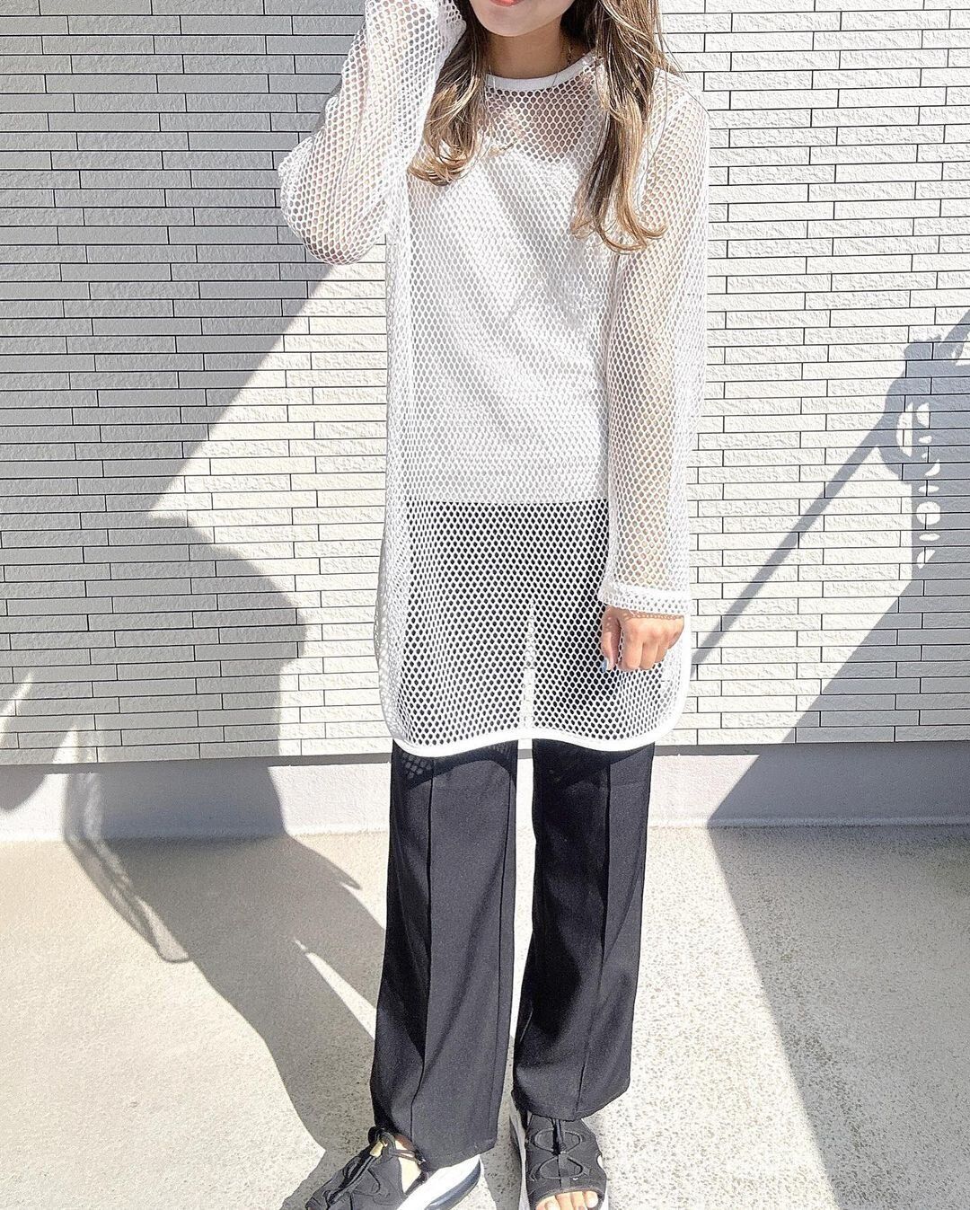 透け感を楽しめるトレンドのメッシュトップスも、少し肌寒い雨の日やムシムシとした日にぴったり。しまむらの「TメッシュスソラウンドロンT/1,089円」は着回しも期待できて、ハイコスパ。通気性がいいので、ムレにくく、快適に過ごせるのが優秀です。