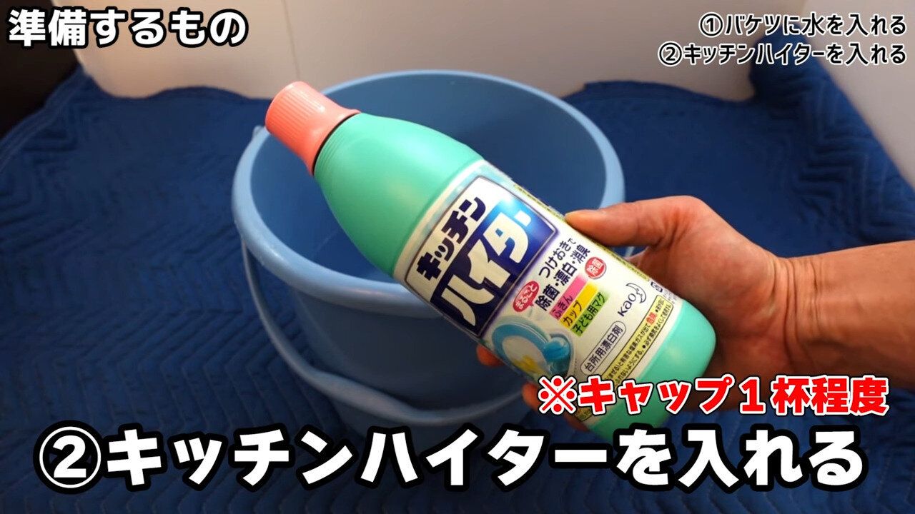 そこへ、塩素系の漂白剤をキャップ1杯程度入れます。