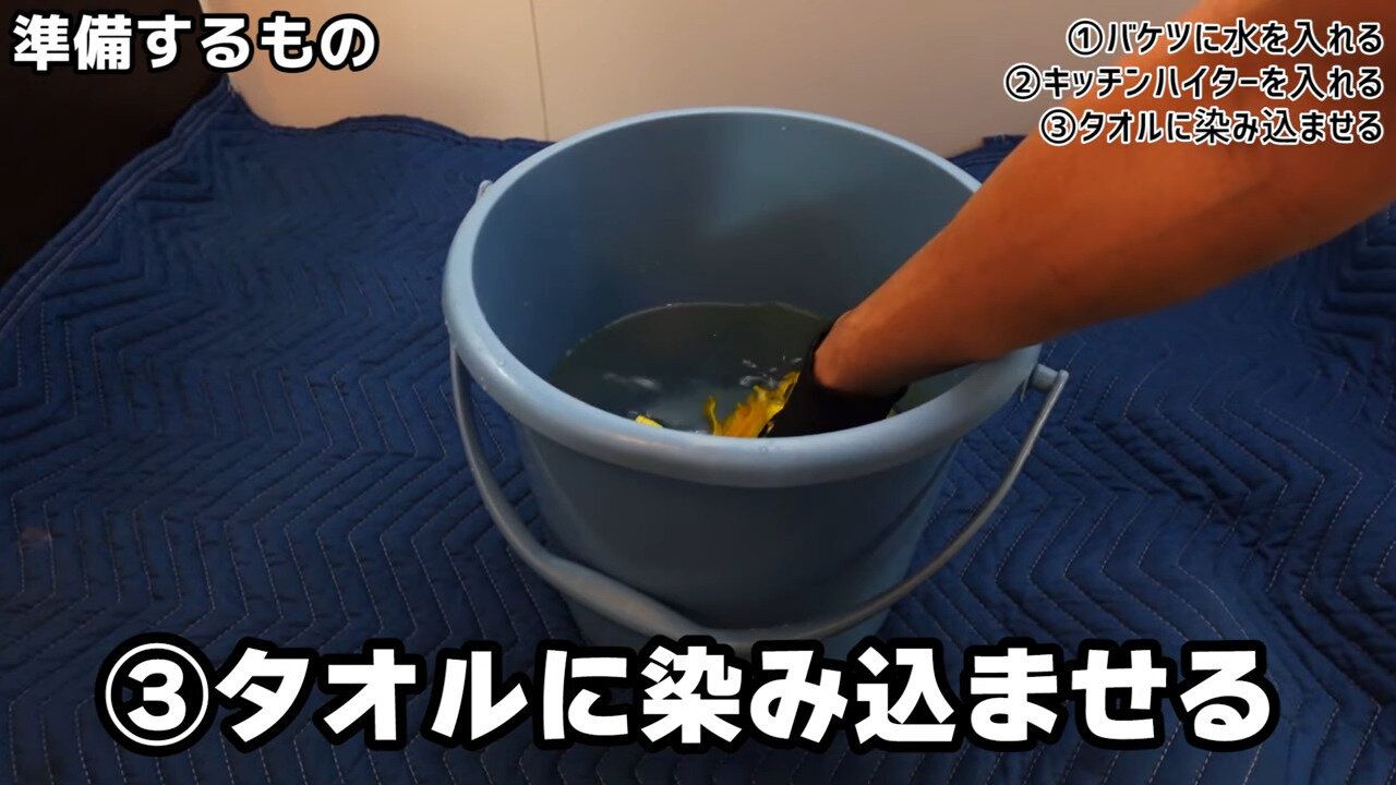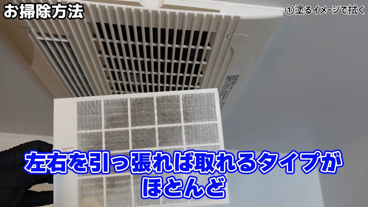 天井をふき終わったら、浴室乾燥機のフィルターも外し、最初のバケツにつけおきしておきます。ここから仕上げの手順まで、30分ほど待ちます。