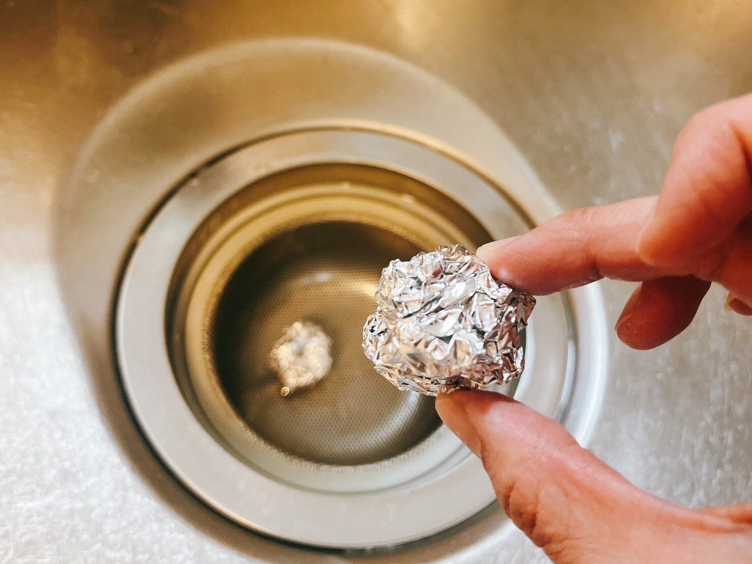 アルミホイルは、水にぬれると、アルミニウムイオンを発生します。このアルミニウムイオンが、抗菌作用を発揮してくれます。ヌメリ防止にもいいとされていますので、2cmくらいに丸めたアルミホイルを1~2個、排水口のゴミ受けにいれておくといいでしょう。くれぐれも丸めたアルミホイルを排水パイプに落とさないように注意しましょう。