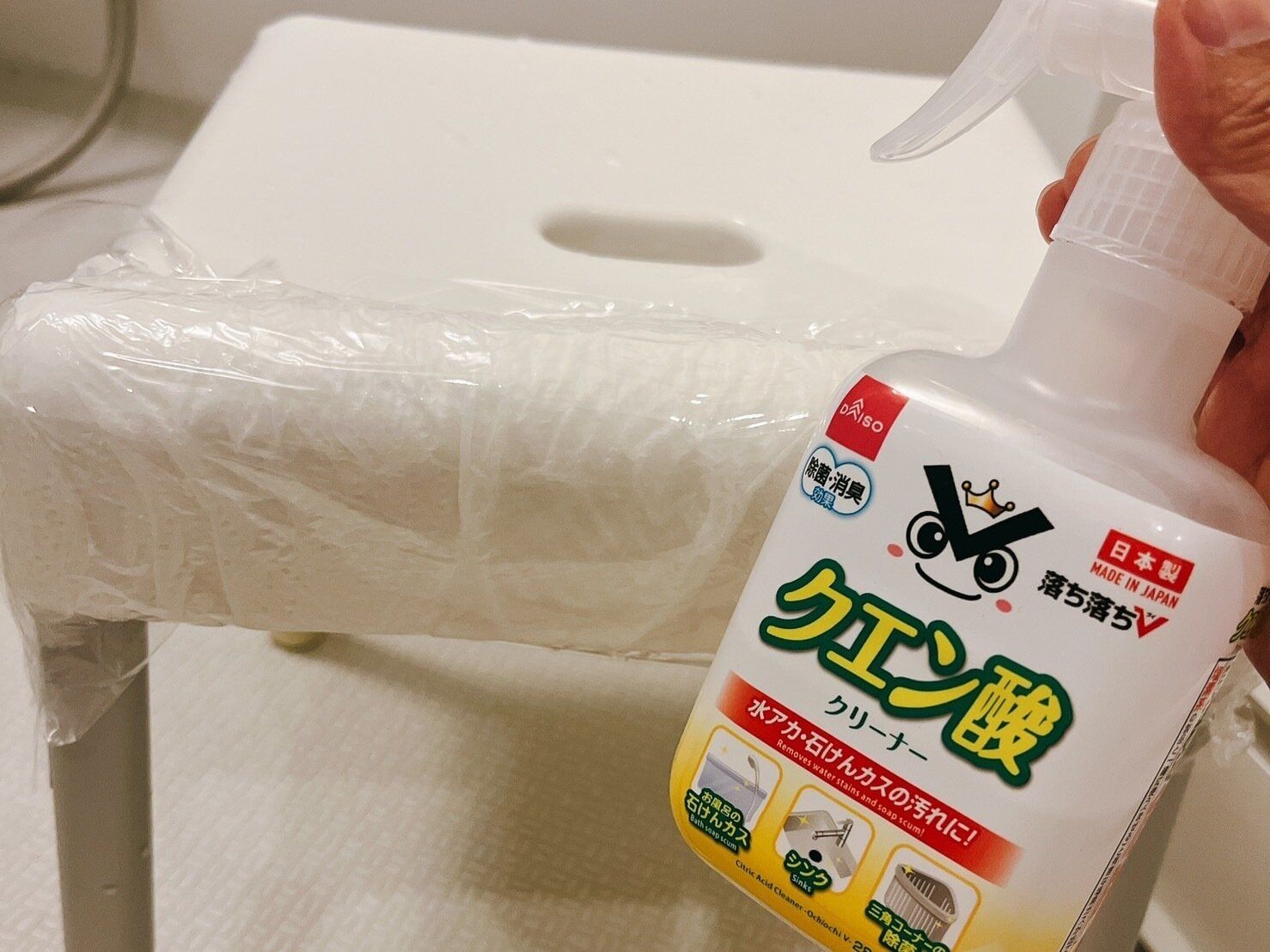 もし、汚れが頑固な場合は、イスにクエン酸スプレーをかけ、その上からキッチンペーパーで覆い、さらにはラップで蒸発を防ぎます。約30分程度放置します。放置後はスポンジで擦り、洗い流します。