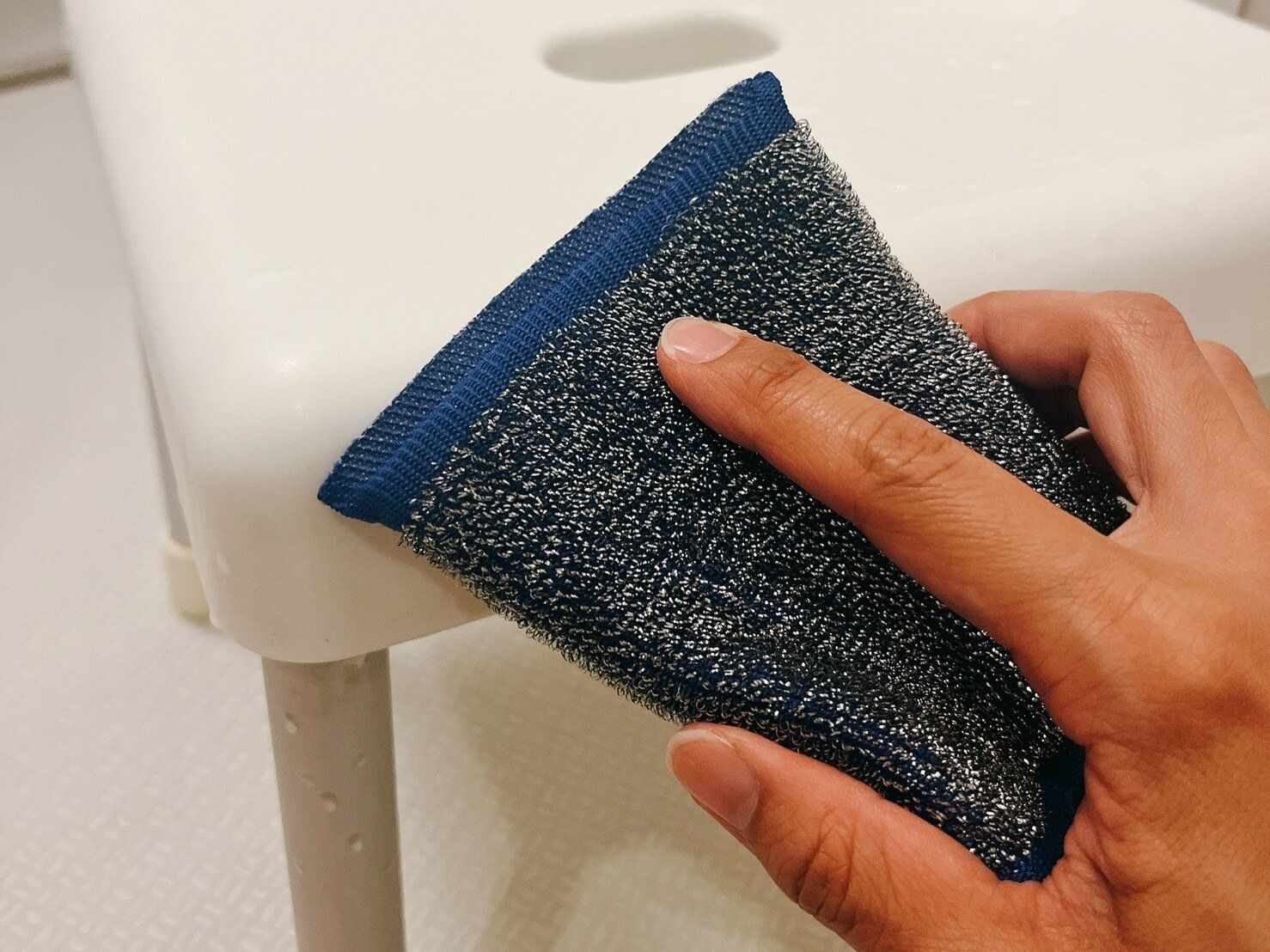 このスポンジをしっかりと濡らし、さらに、お風呂のイスもしっかりと濡らします。そして、汚れている箇所を擦ります。濡らして擦るだけで、汚れが驚くほどスルスルと落ちていきます。