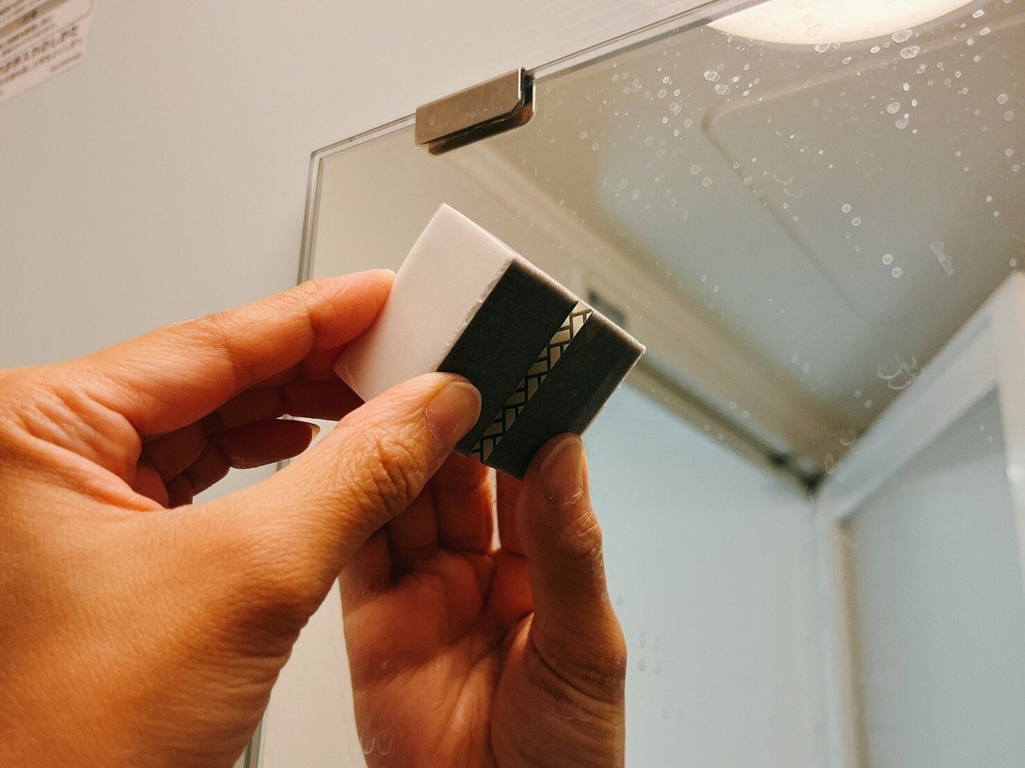 水垢掃除におすすめなのが、ペタっと貼れるクレンザーパッドです。水をつけて磨くだけで頑固な水垢が取れる優れもの。掃除をする時は、デコボコした面を使用します。デコボコ面を濡らして、水垢が気になる箇所を擦るだけ。掃除が終わった後は、磨く面と逆側の面が壁にペタっとつくようになっているので、収納にも困りません。