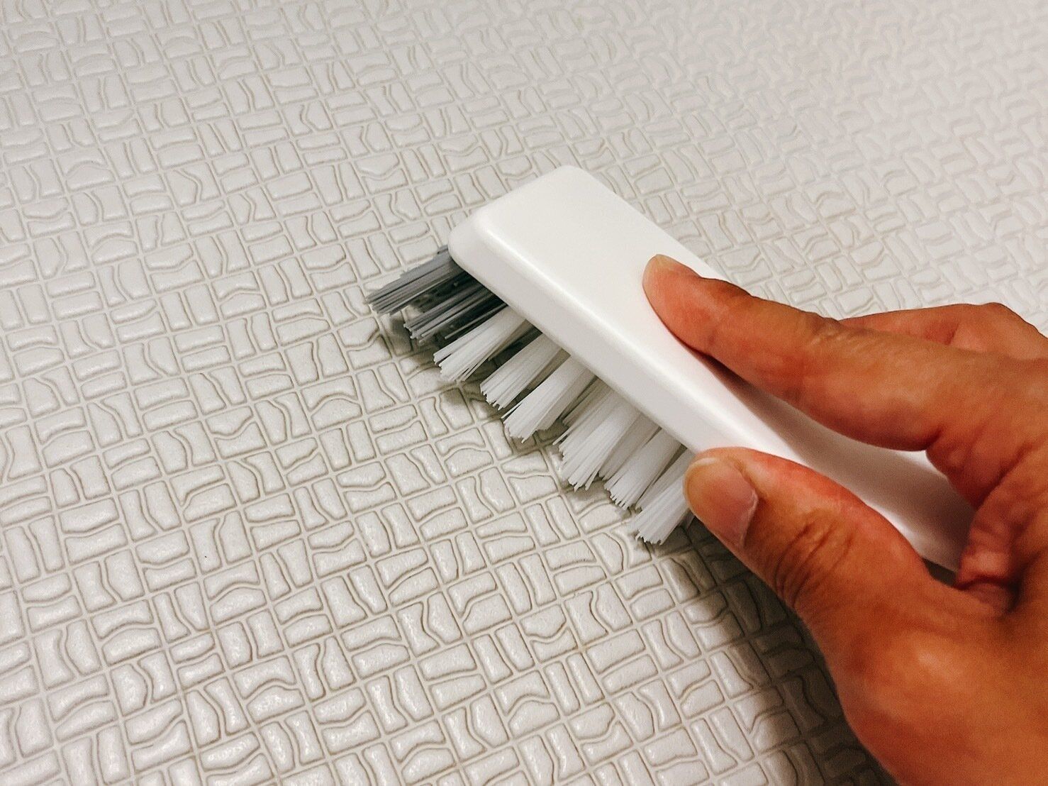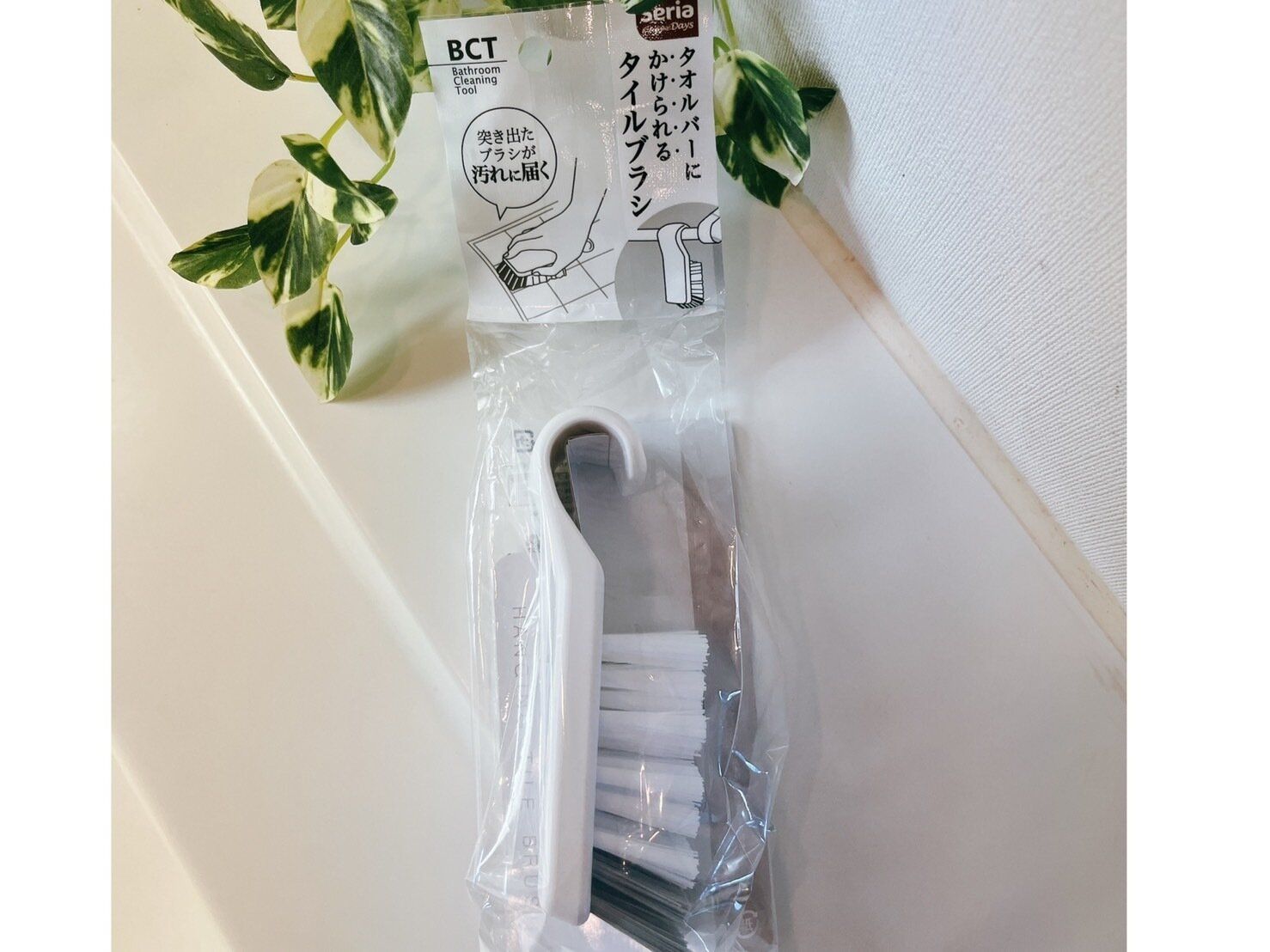 床のタイル掃除におすすめの道具が、セリアのタオルバーにかけられるタイルブラシです。溝の汚れはかき出すのに苦労しますが、これはブラシ部分がつき出ているので、楽々掃除ができます。