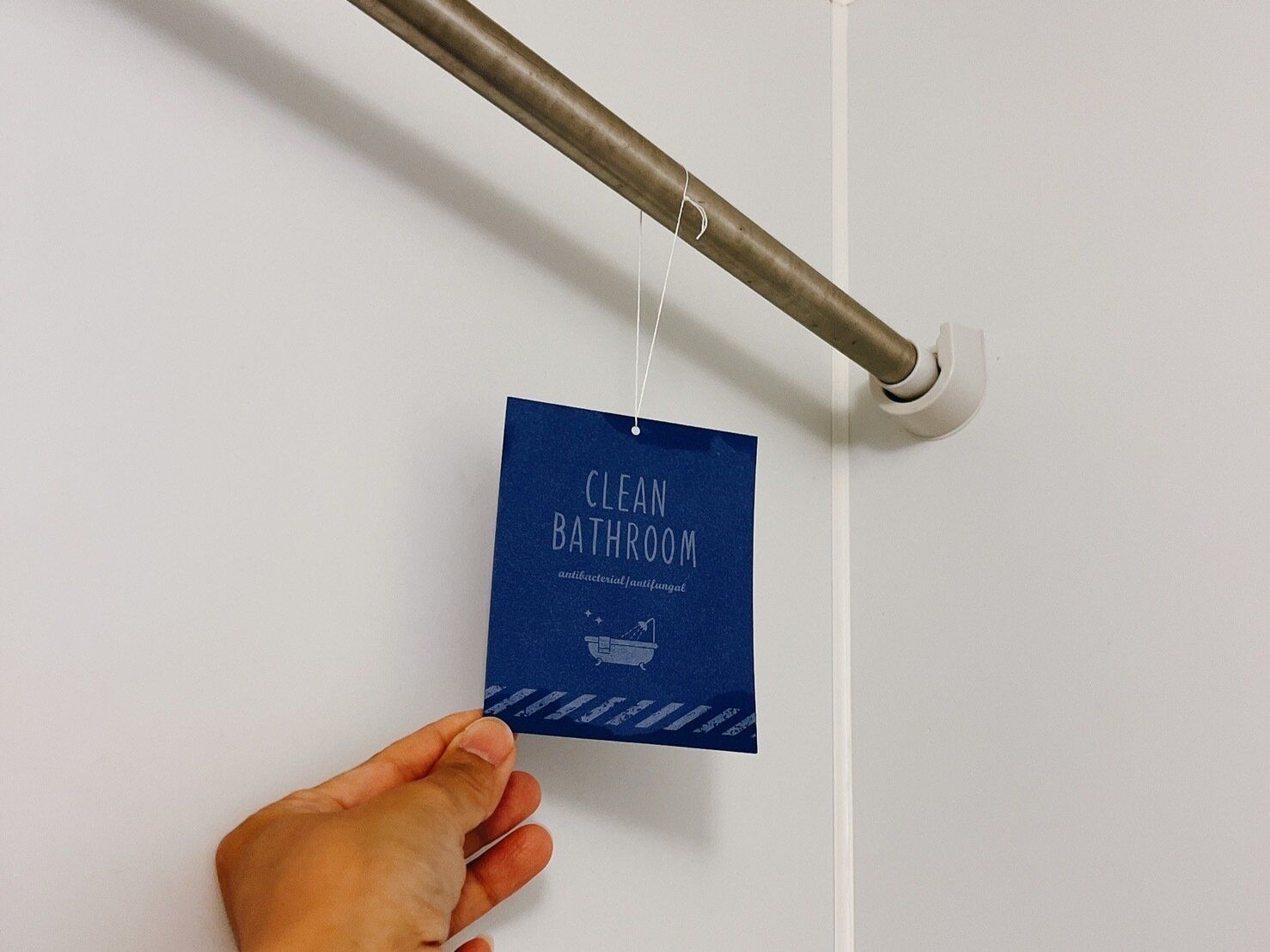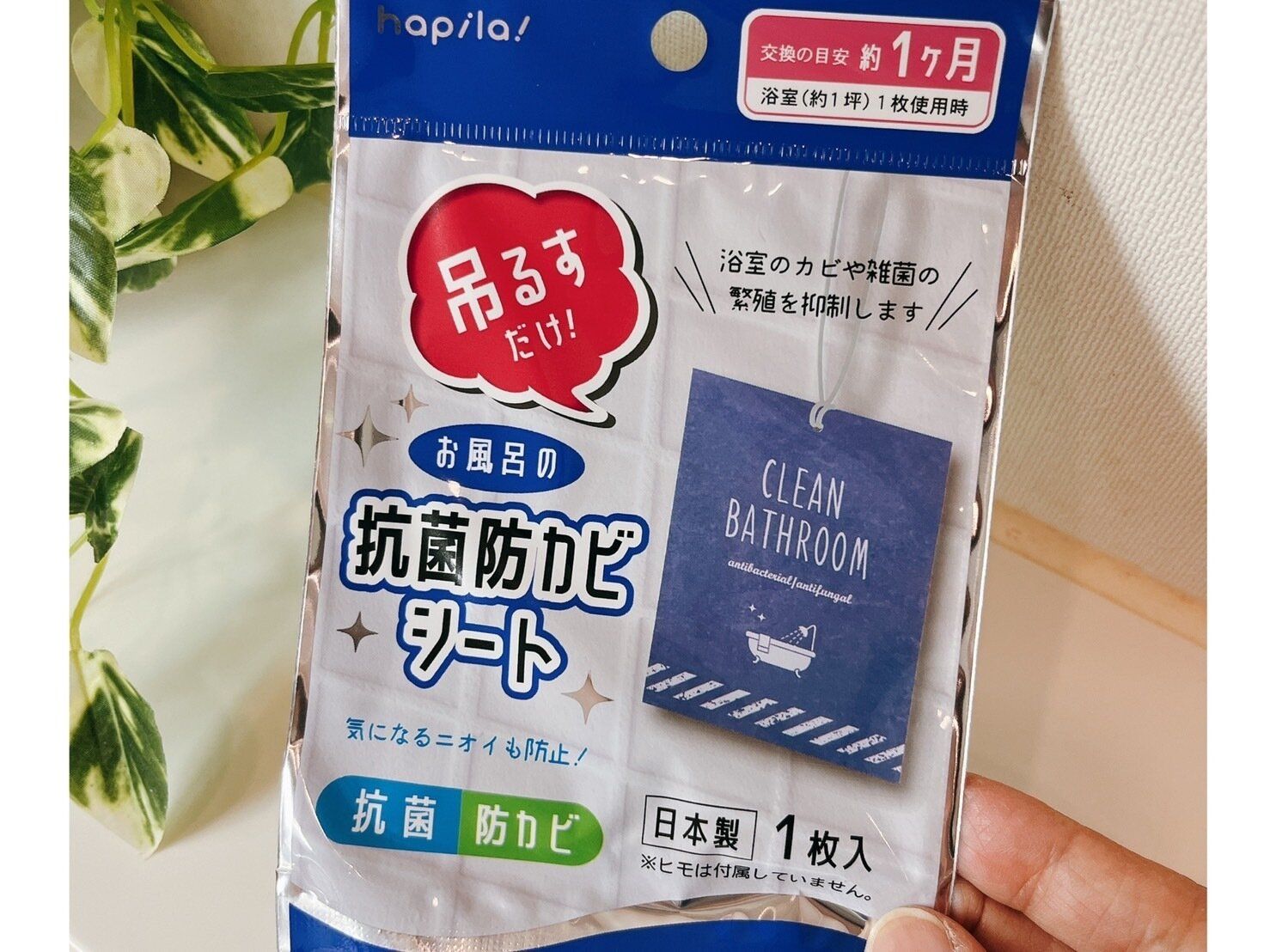 ダイソー商品でカビ予防ができるのが、防菌防カビシート。お風呂内に吊るすだけで防カビになるなら試してみたいですよね。家にある紐をシートに通して、吊るすだけ。